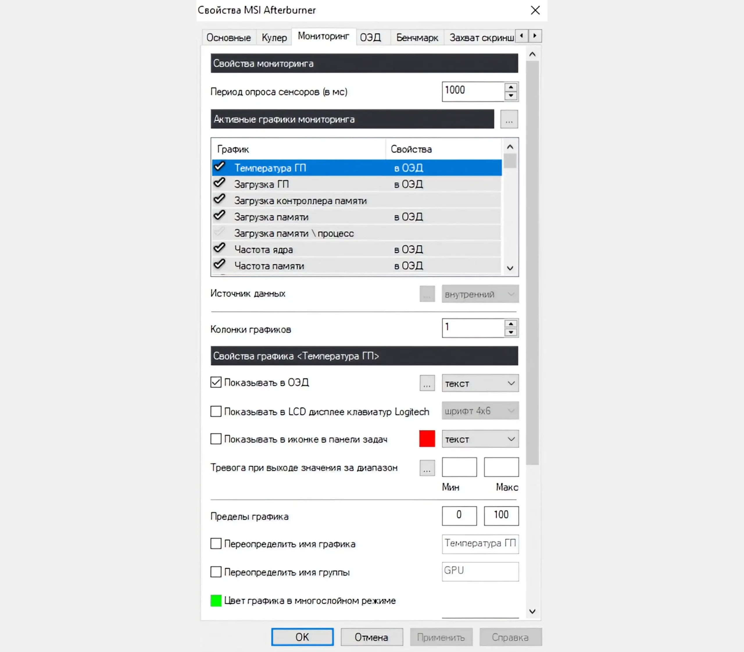 Показатели для отслеживания вы можете выбрать вручную в свойствах MSI Afterburner в разделе «Мониторинг». Рядом с нужным параметром поставьте галочку, а ниже, в пункте «Свойства графика», нажмите «Показывать в ОЭД».