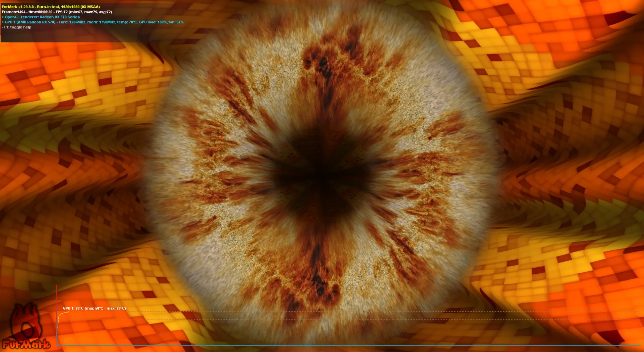 Furmark — это самый простой способ проверить видеокарту на артефакты. Но, кроме электронных компонентов, тест сильно нагружает и систему охлаждения, так что одновременно вы сможете проверить и ее. Температура GPU за время теста не должна выходить за критическую отметку в 95°. Также вы не должны слышать тресков, писков и других посторонних шумов — только гул вентиляторов. Если что-то из этого «вылезло», лучше отнести видеокарту на проверку к специалистам.