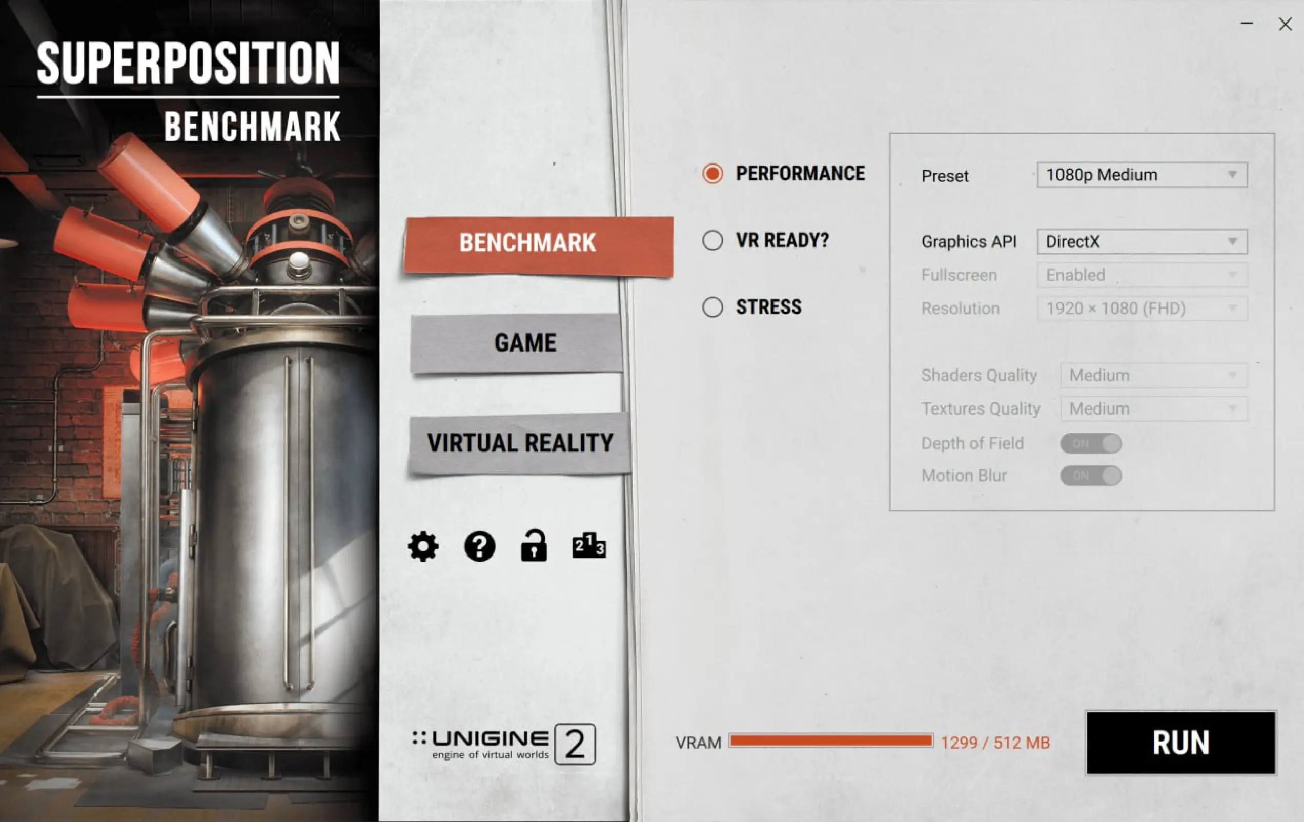 Интерфейс прост и лаконичен. Во вкладке Benchmark перейдите в окно Performance и выберите желаемый пресет. На выбор есть 720p, три режима 1080p, 4K и 8K. Ниже определитесь с API. Можно протестировать и в DirectX, и в OpenGL. Далее кликните Run — и дождитесь окончания прогона.