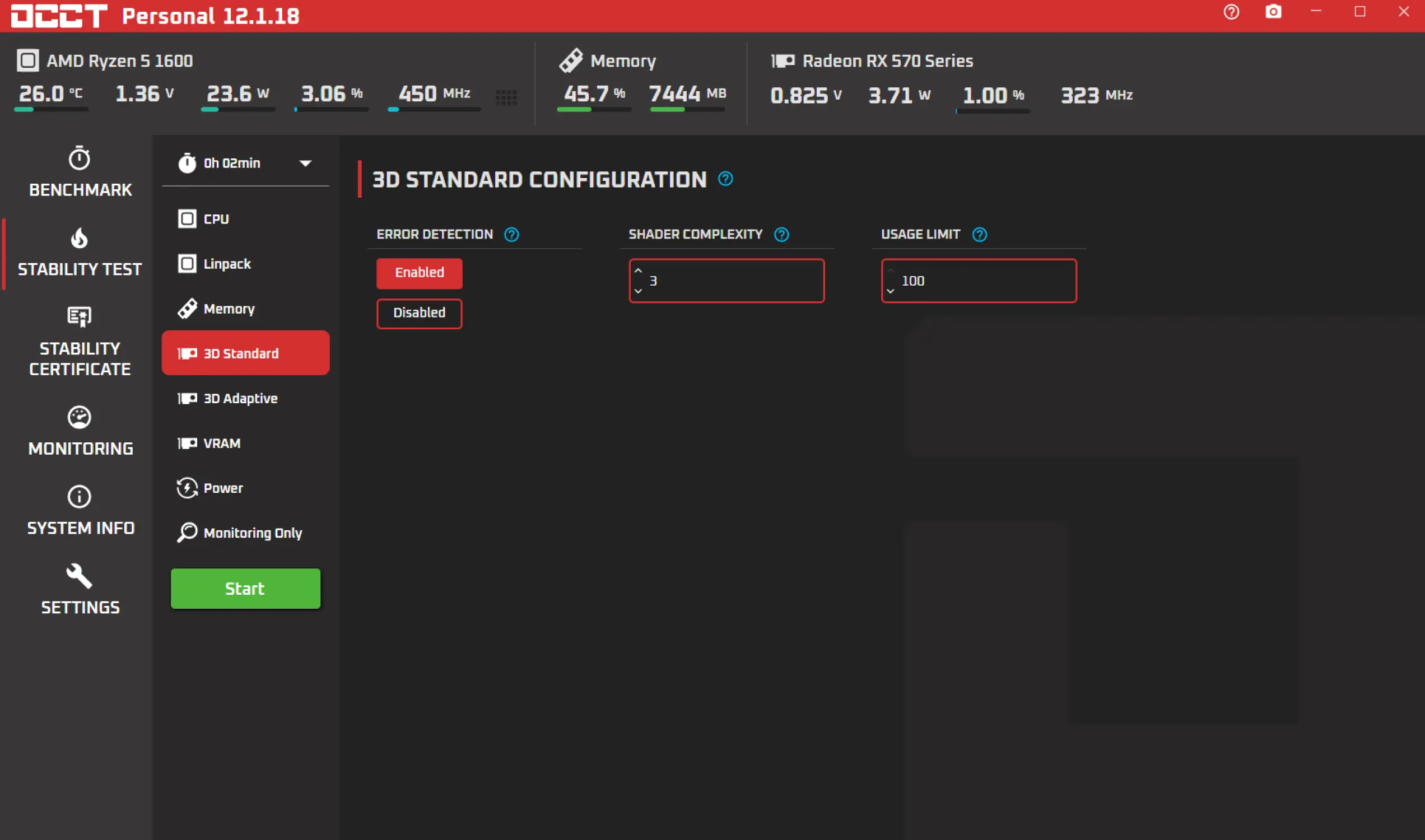 Один из самых крутых и полных тестов для видеокарты — OCCT. С помощью этой утилиты можно проверить работу видеокарты в режиме полной нагрузки (3D Standard), переменной нагрузки (3D Adaptive), а также отдельно протестировать видеопамять. Из-за обилия настроек интерфейс здесь немного сложнее, чем у других программ, однако для базового теста видеокарты (в 3D Standard) можно почти ничего не менять. Достаточно установить время теста, щелкнув по таймеру над вкладкой CPU и включив (Enabled) определение ошибок (Error Detection). На проведение процедуры обычно рекомендуется закладывать от 30 минут до одного часа.