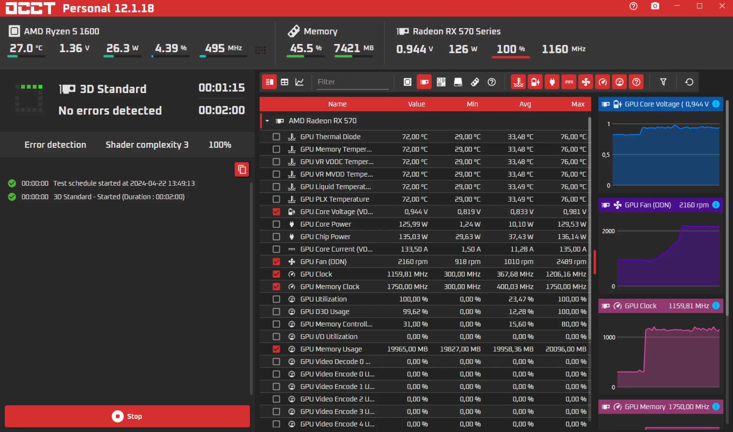 По клику Start начнется тест видеокарты, во время которого лучше не пользоваться ПК. Удобство OCCT в том, что утилита выдает полную системную информацию прямо во время прогона. В режиме реального времени вы сможете посмотреть нагрузку на компоненты видеокарты, напряжение по линиям питания, скорость вентиляторов и температуру.