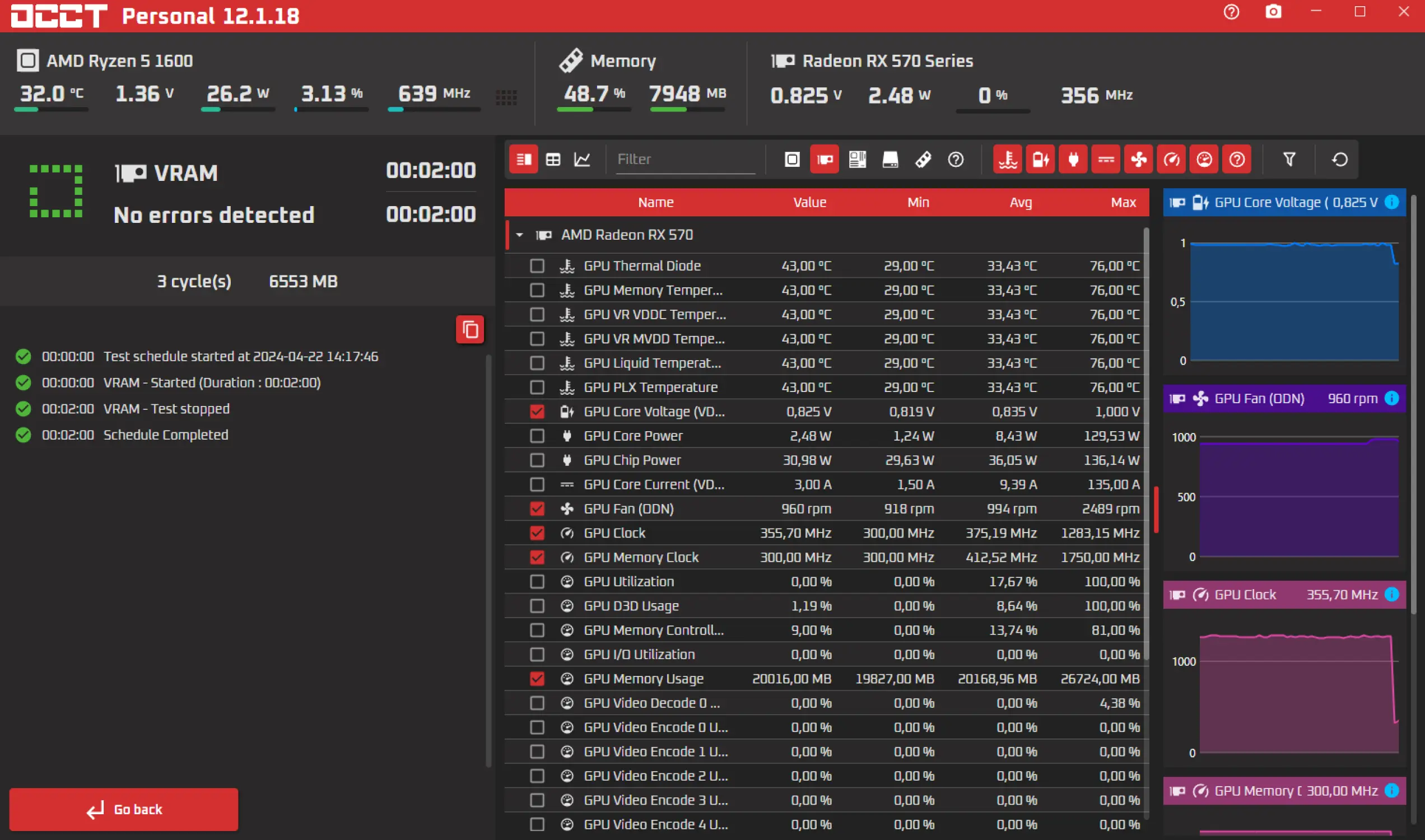 Дополнительно стоит проверить видеопамять во вкладке VRAM. Желательно тестировать память хотя бы 30 минут. В идеале ошибок по памяти не должно быть в принципе. Несколько десятков ошибок — не критично, но это повод задуматься о визите в сервисный центр. Если же OCCT показывает тысячи ошибок во время теста, то тут однозначно можно возвращать видеокарту в магазин для проведения гарантийного ремонта или замены на другую модель.