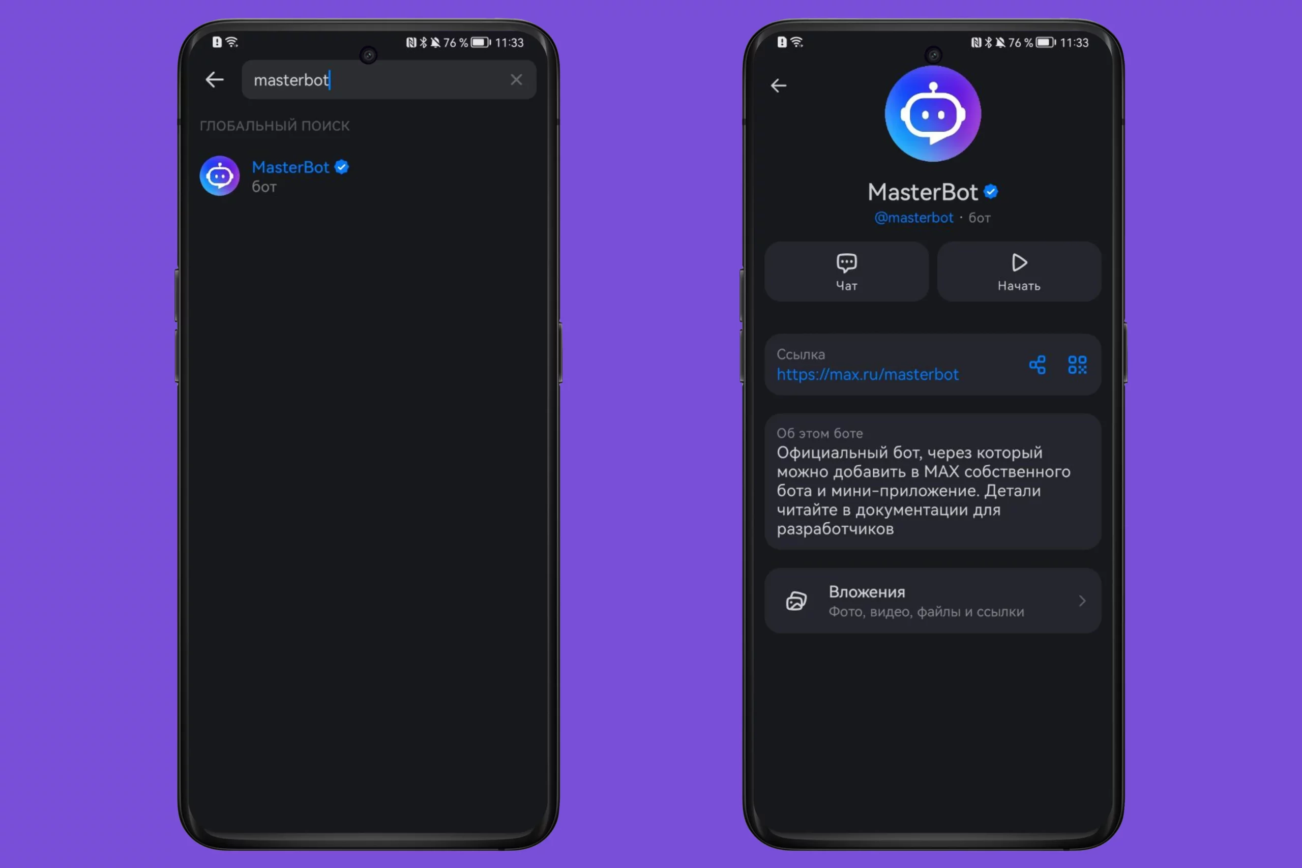 Первым делом нужно найти в поиске MAX главного бота — @MasterBot. Это аналог BotFather из Telegram — официальный инструмент для регистрации и управления ботами. Находим его в поиске по никнейму, открываем чат и нажимаем «Начать».