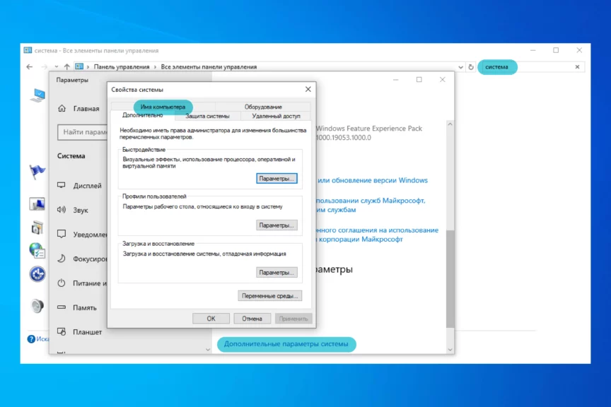 Сначала убедитесь, что оба ПК находятся в одной рабочей группе. Для этого в поиске по панели управления введите «Система», кликните на первый найденный пункт меню и далее откройте «Дополнительные параметры системы».