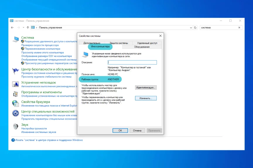 Затем выберите вкладку «Имя компьютера» и посмотрите название рабочей группы. Если на двух ПК они разные, то создайте новую через меню «Изменить» и введите одинаковое название на одном и другом ПК.
