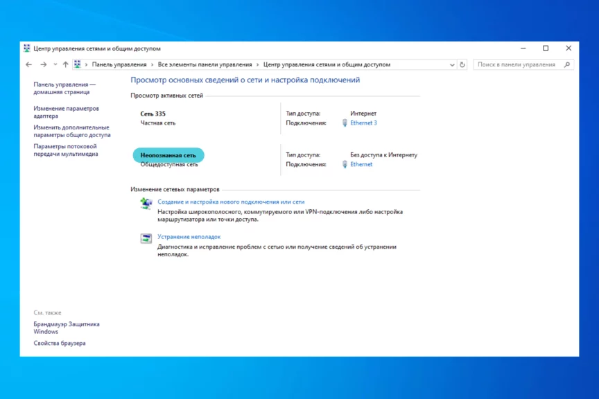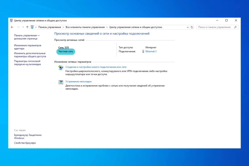 Чтобы проверить статус точки доступа, в поиске по панели управления найдите «Центр управления сетями и общим доступом» и там отыщите ваш Wi-Fi. Если под ним написано «Общедоступная сеть», то нужно это исправить: