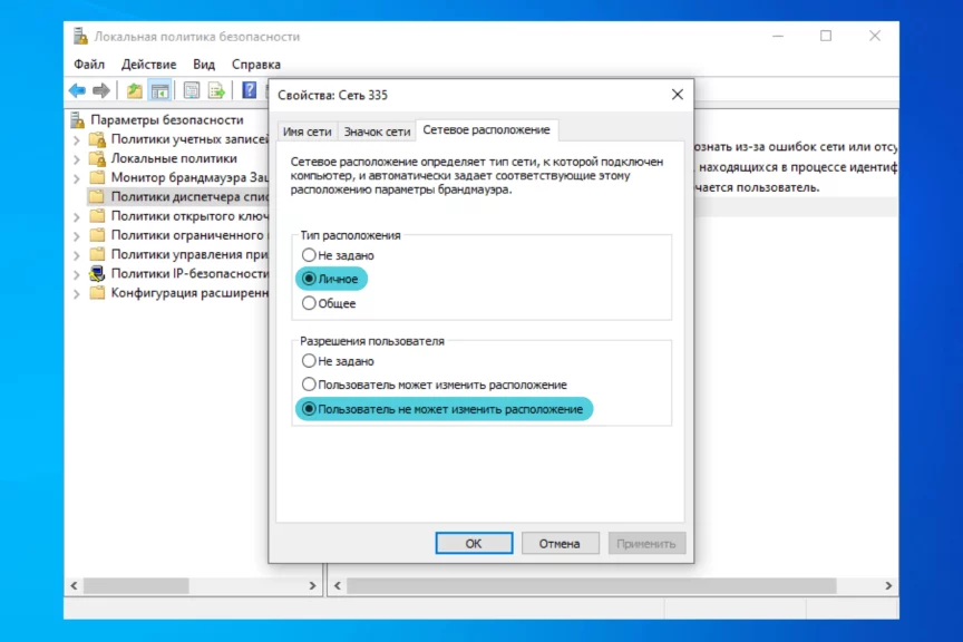 - В типе расположения нажмите «Личное», в разрешениях пользователя — последний пункт, который запрещает менять расположение.