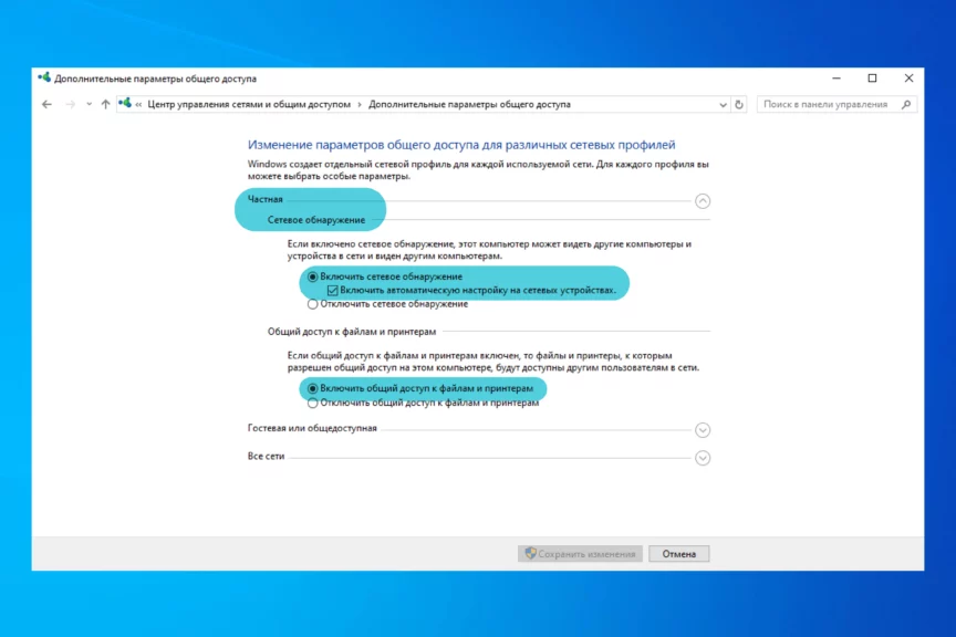 Найдите «Центр управления сетями…», выберите «Управление расширенными параметрами…», нажмите на выпадающий список «Частная» и активируйте сетевое обнаружение, чуть ниже — общий доступ к файлам и принтерам и автоматическую настройку на сетевых устройствах.
