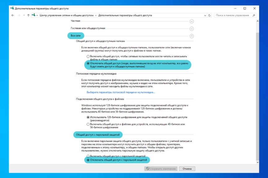В выпадающем списке «Все сети» сверху отметьте строчку «Отключить общий доступ…», а в самом низу уберите парольную защиту. Это нужно, чтобы пользователи в одной точке Wi-Fi могли видеть расшаренные файлы и папки, так как сделать домашнюю сеть из двух компьютеров иначе не получится.