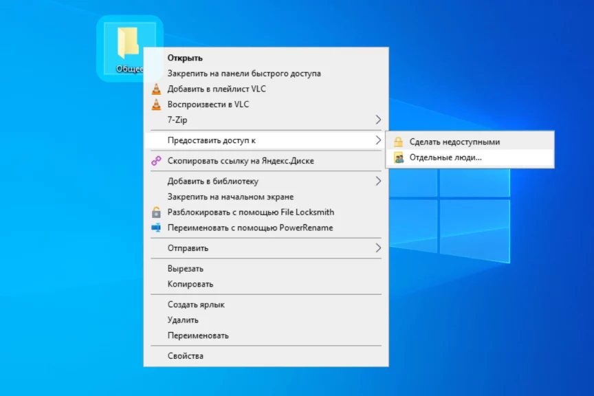 Открыть файлы или папки можно сразу всем участникам сети или отдельным пользователям. Чтобы выбрать подходящий способ, щелкните правой кнопкой мыши по файлу или папке, которую хотите расшарить, и выберите «Предоставить доступ к…"/"Отдельные люди».