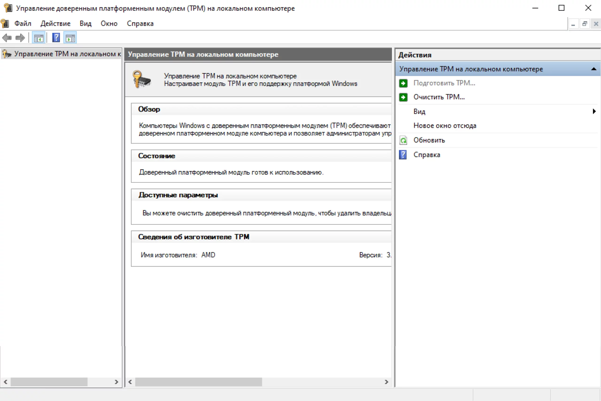 Также в обязательных требованиях к Windows 11 значится наличие в системе модуля безопасности TPM 2.0. Чаще всего он интегрирован в материнскую плату либо его функции выполняет процессор, но прикупить чип можно и отдельно. Проверить, есть ли в системе TPM 2.0, можно, нажав сочетание клавиш Win+R и введя команду tpm.msc. Если модуль есть и он активирован, вы увидите меню, как на картинке ниже.
