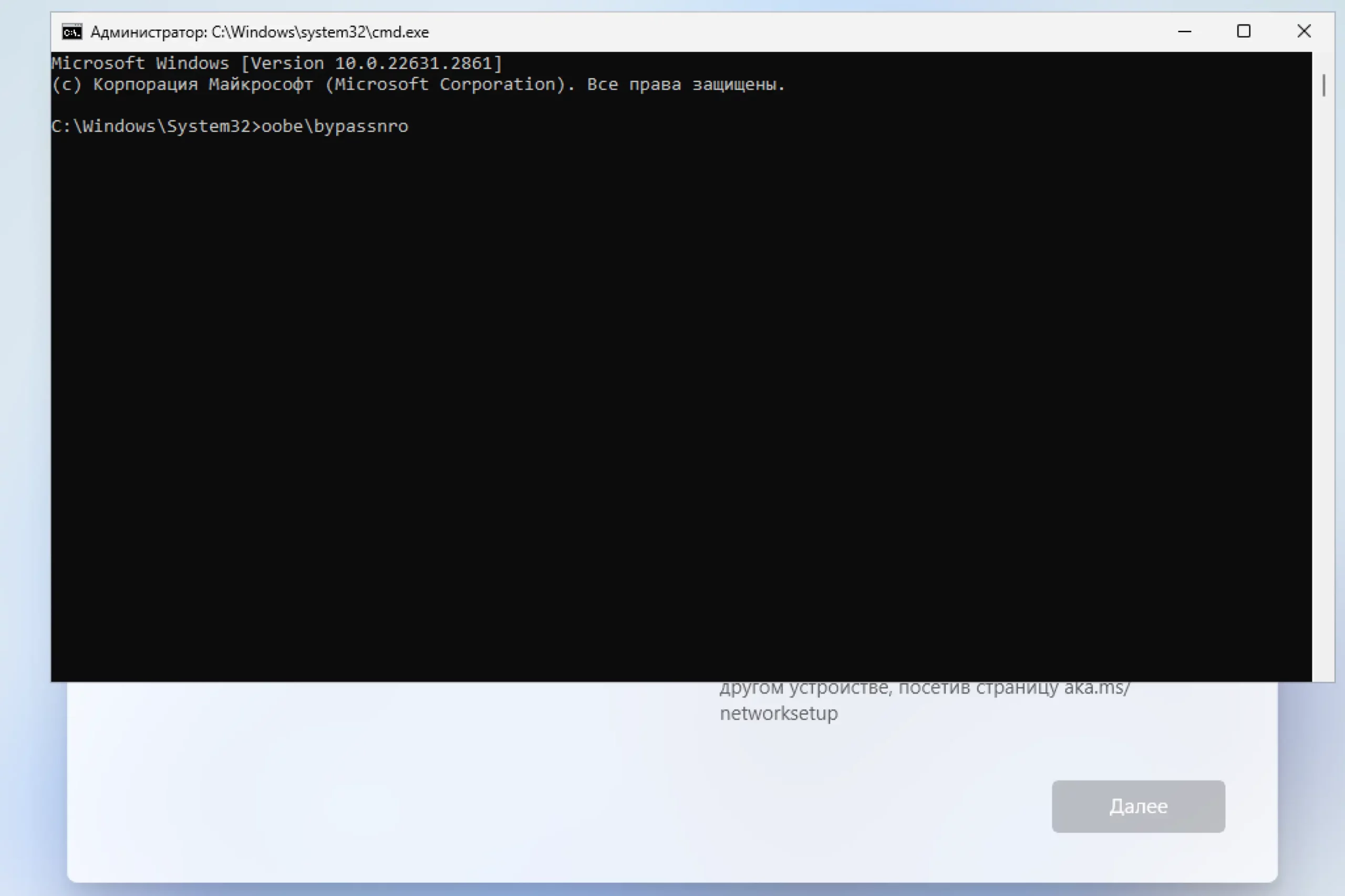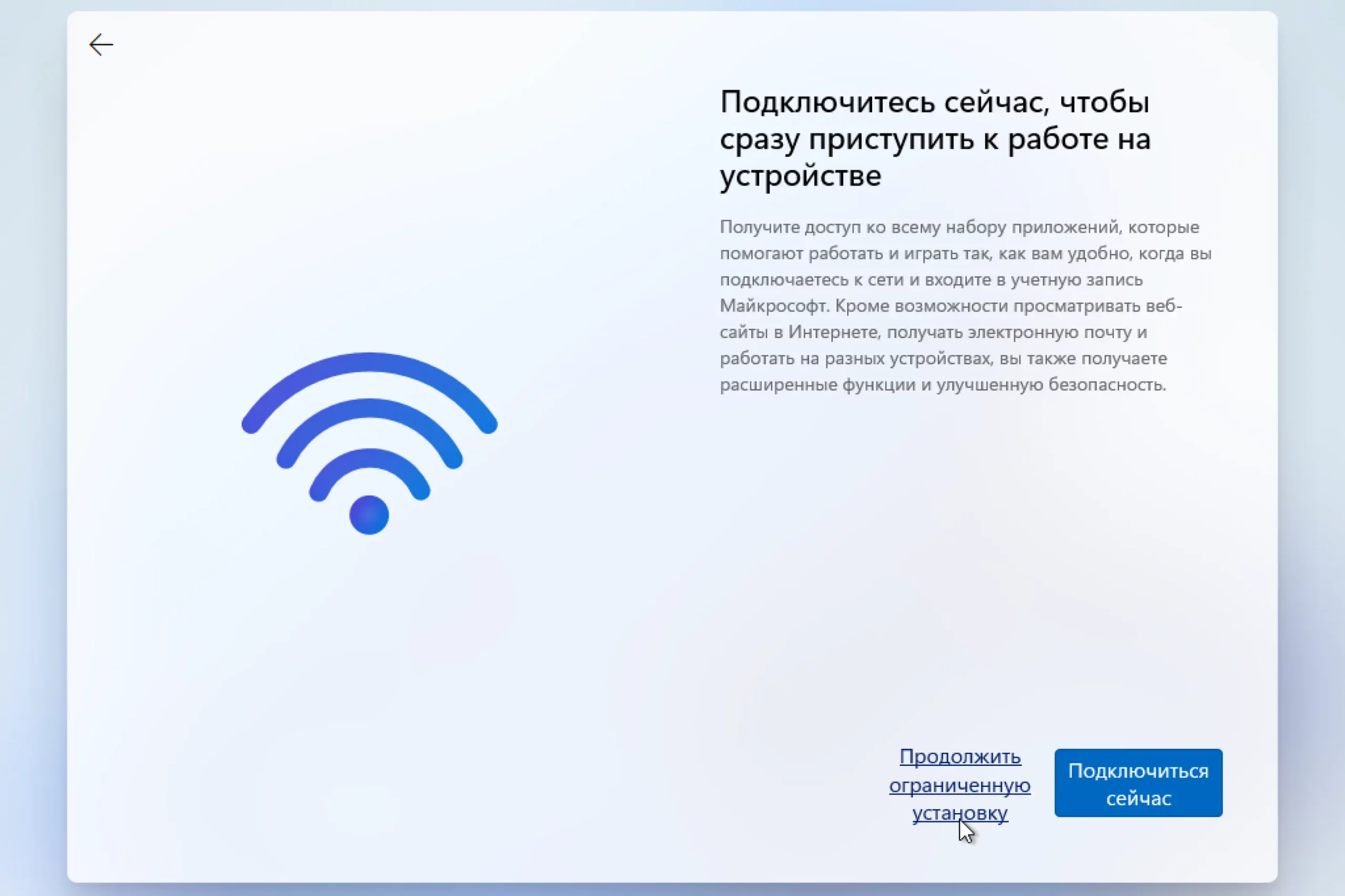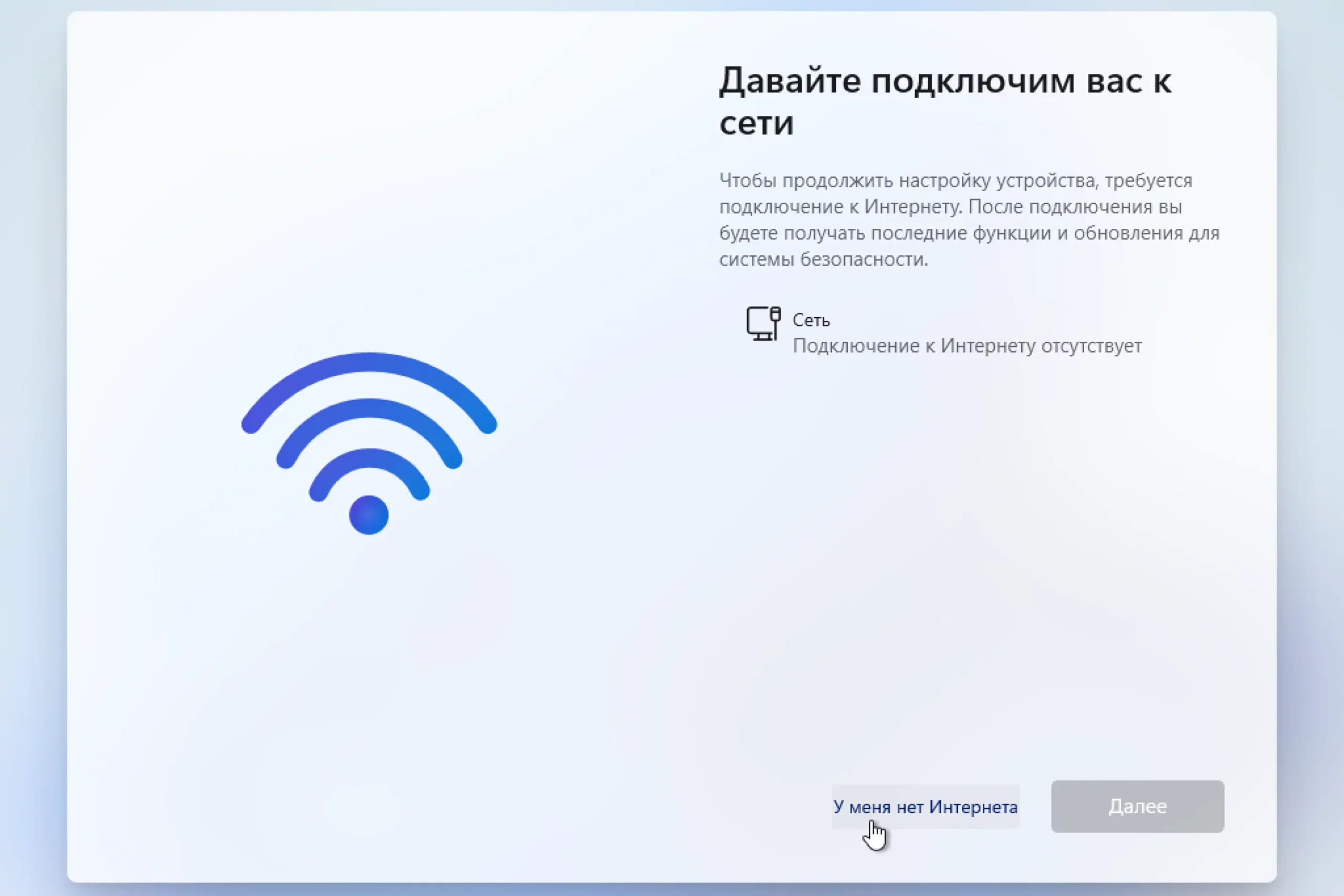 Часто бывает, что при установке операционной системы подключиться к интернету по кабелю нет возможности, а Wi-Fi драйвер еще не установлен, поэтому установка Windows 11 просто стопорится на этом пункте. К счастью, можно его пропустить. Достаточно нажать сочетание клавиш Shift + F10, ввести в командную строку OOBE\BYPASSNRO и нажать Enter. После система перезагрузится, появится заветный пункт «У меня нет интернета» и возможность «Продолжить ограниченную установку».