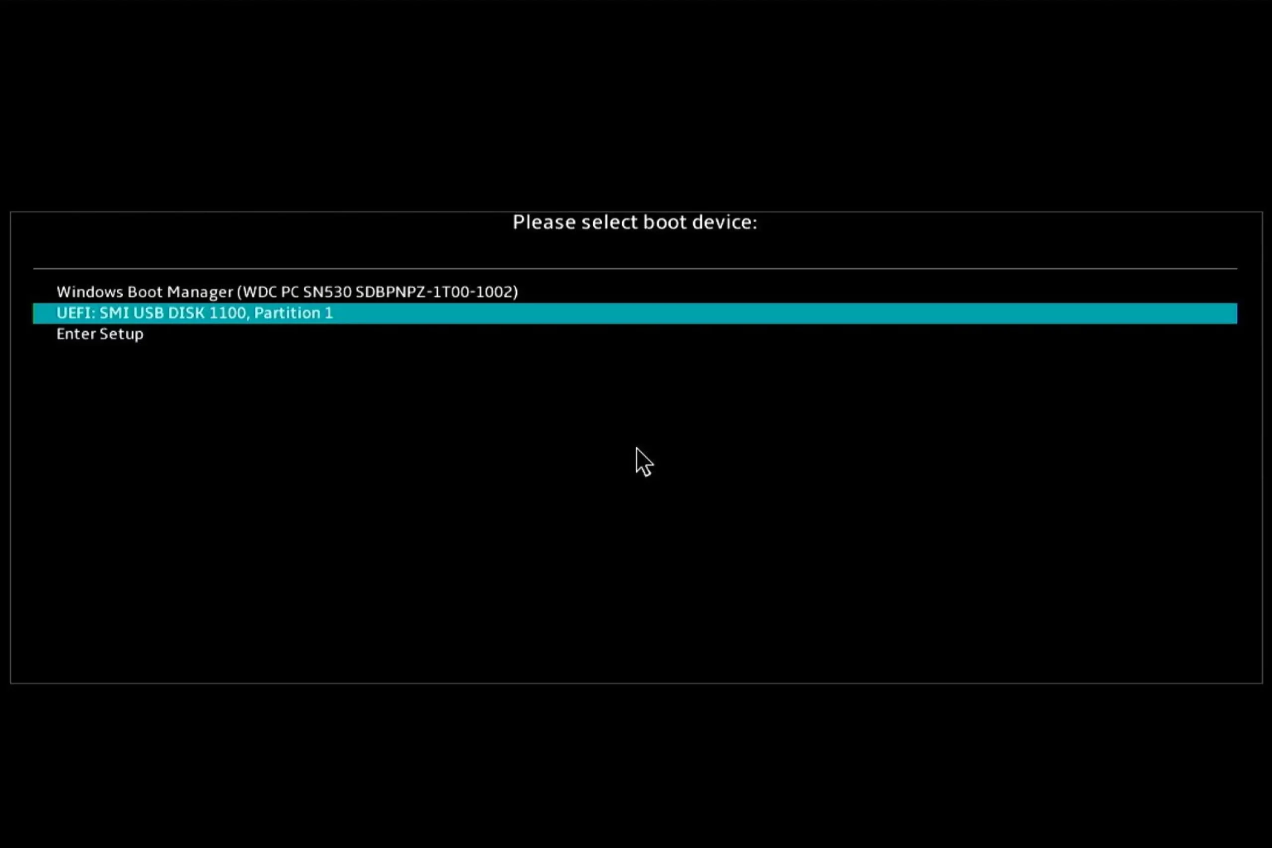 В появившемся окне с помощью стрелочек на клавиатуре нужно выбрать USB-накопитель с образом Windows 11 и нажать Enter для инициализации загрузки флешки и, следовательно, начала установки ОС.