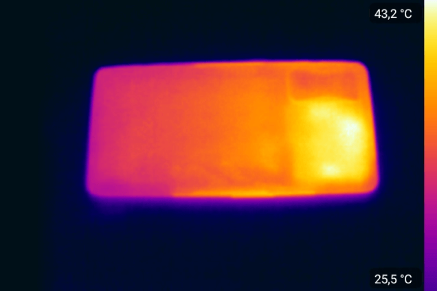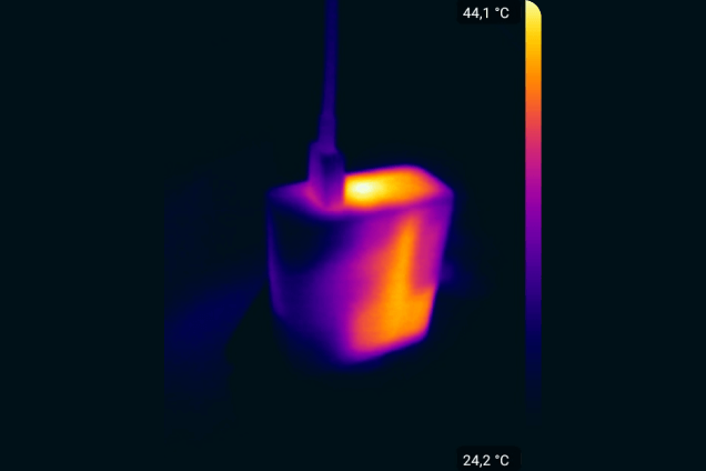 И действительно, задняя сторона смартфона во время зарядки прогрелась не более чем до 40 °C. Это очень и очень хороший показатель! Температура же корпуса зарядного устройства за эти 17 минут не превысила отметку 45 °C.