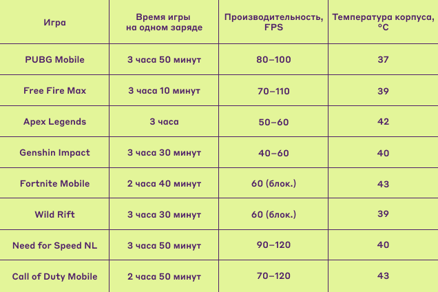 Оценить время автономной работы смартфона достаточно сложно — все очень сильно зависит от конкретного сценария использования: режима производительности, яркости и частоты обновления экрана, уровня сигнала сети и непосредственно самой игры. Результаты измерений представлены в таблице, где, помимо времени автономной работы, приведены замеры FPS (количество кадров в секунду: больше — лучше, нормальный уровень производительности считается от 30 FPS) и температуры корпуса при помощи тепловизора. Это наиболее популярные сегодня названия, в которые играют на смартфонах.