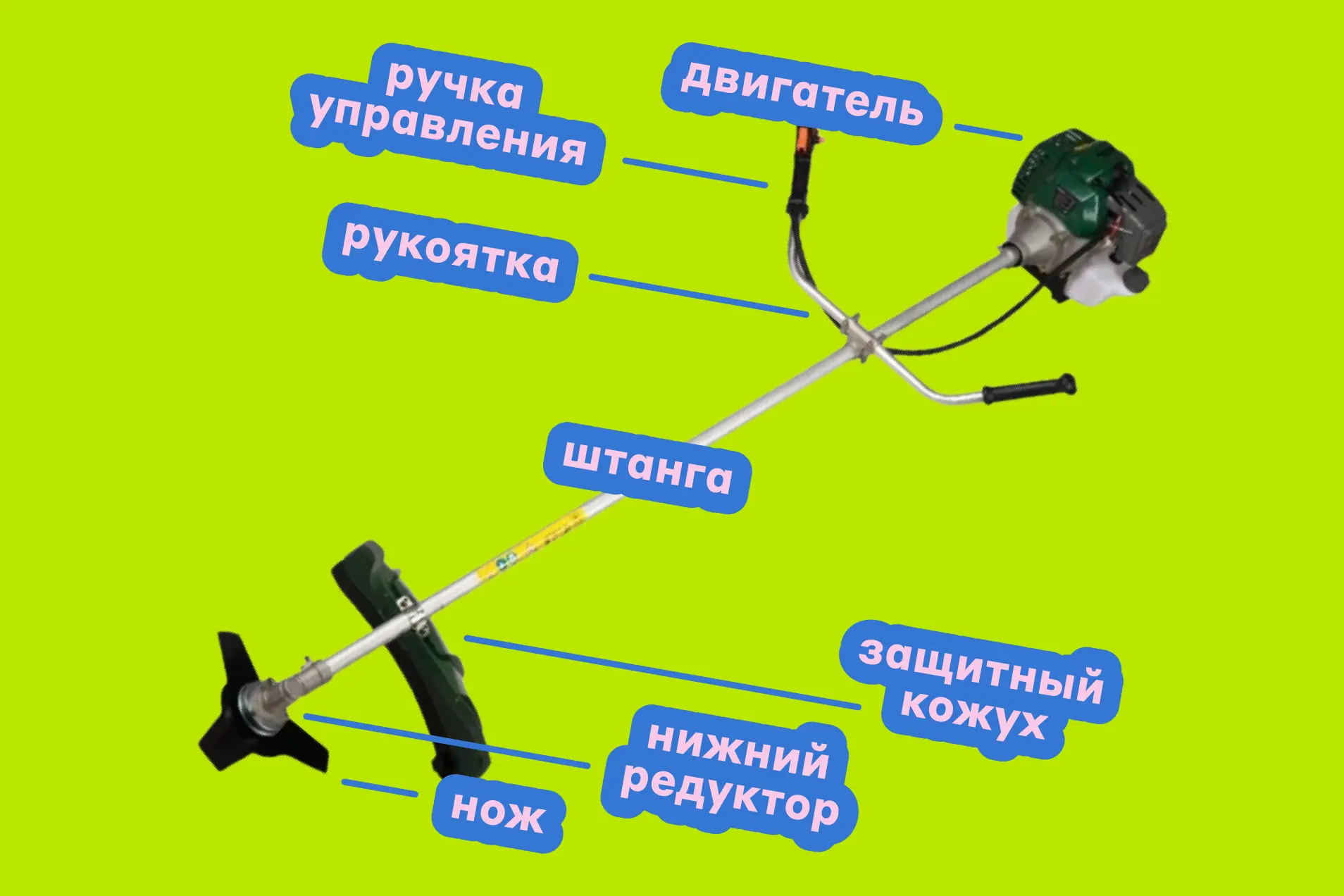 Рабочим элементом в триммере выступает режущая головка с леской или нож. В движение их приводит двигатель (электрический или бензиновый) через редуктор, а специальный кожух защищает человека от летящей в стороны травы и фрагментов веток.