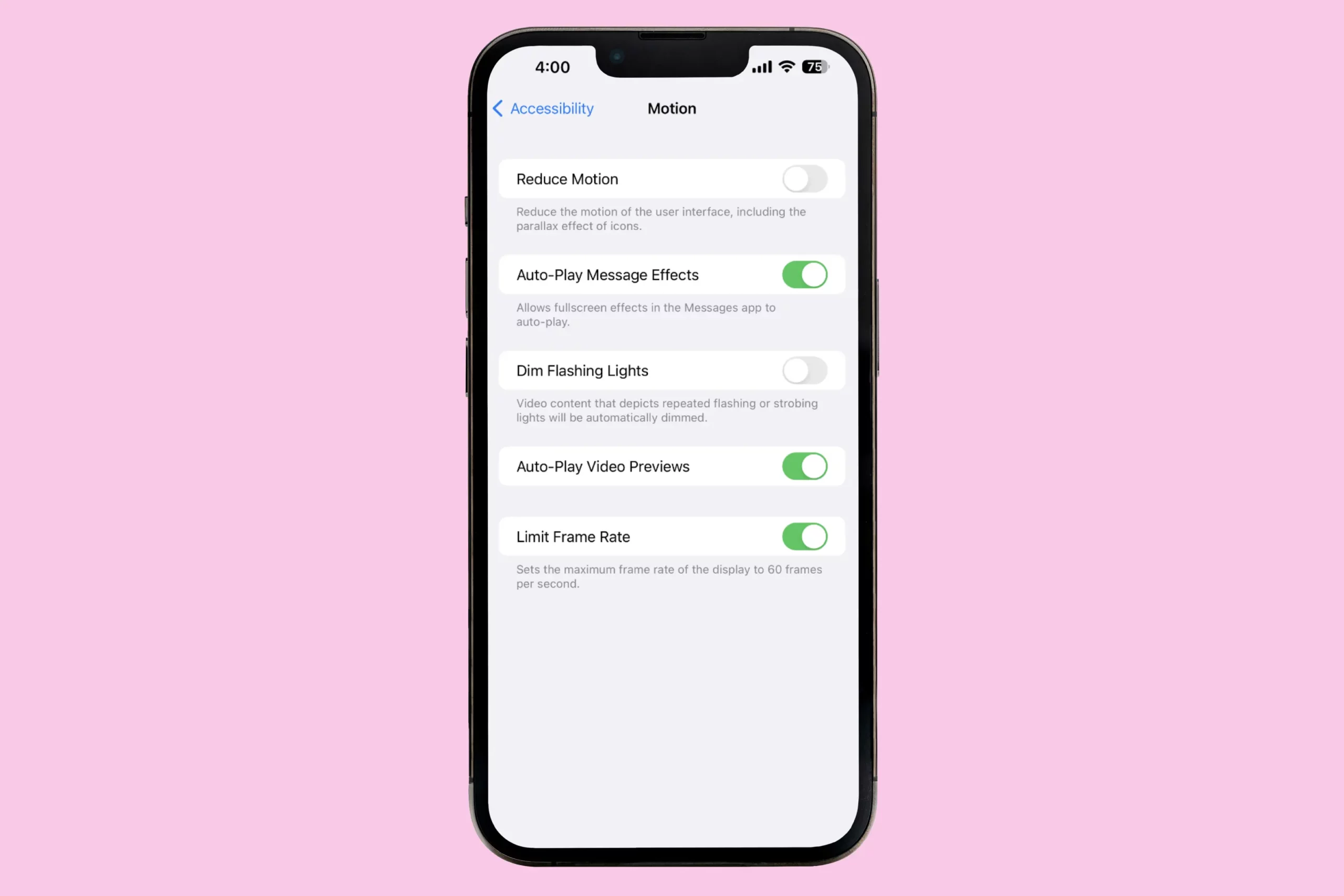 Чтобы ограничить частоту обновления экрана на iPhone, перейдите по пути «Настройки» → «Универсальный доступ» → «Движение» и переключите ползунок «Ограничение частоты кадров» в активный режим.