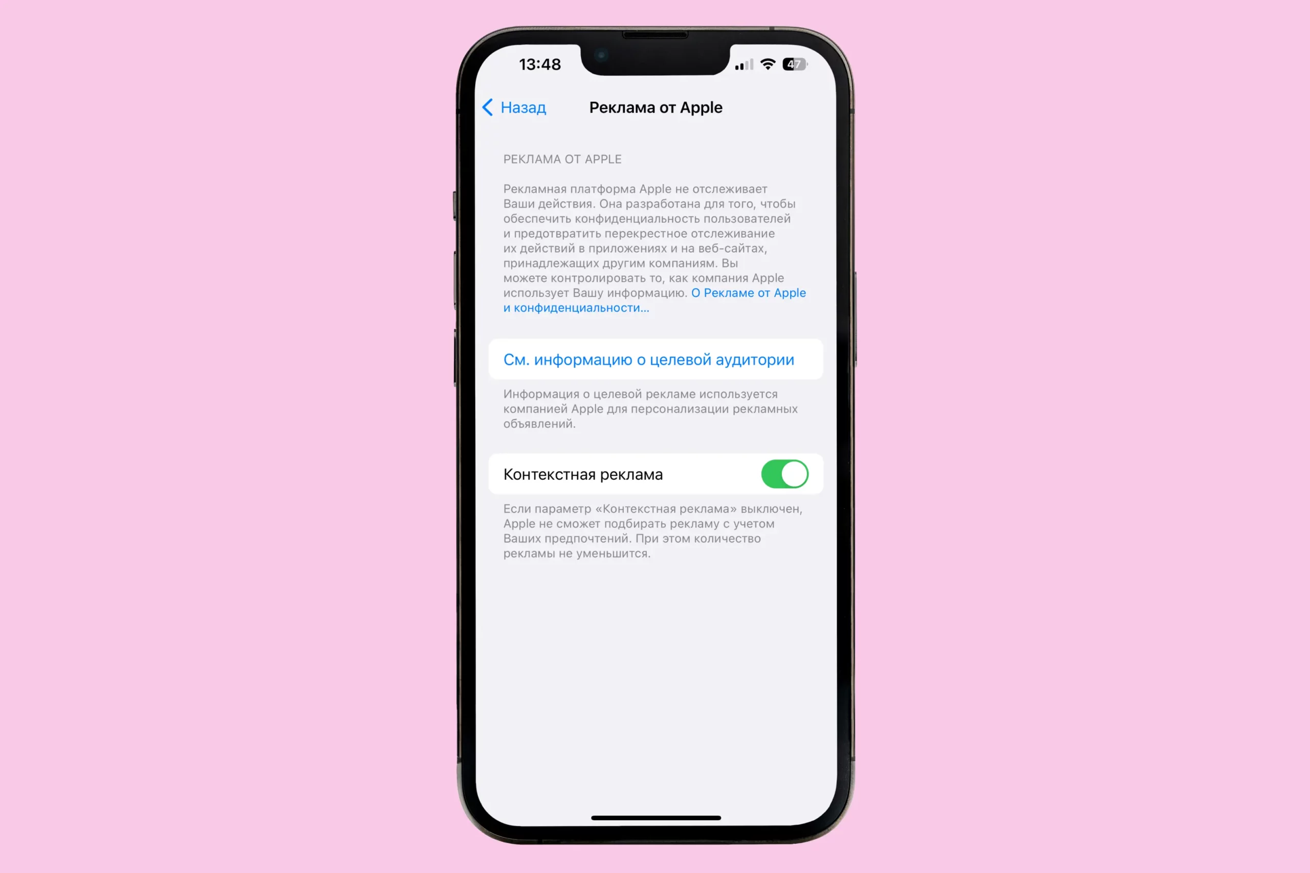 На iPhone персонализированная реклама отключается проще. Перейдите по пути: «Настройки» → «Конфиденциальность и безопасность"→ «Реклама Apple» — и переведите ползунок «Контекстная реклама» в неактивный режим.