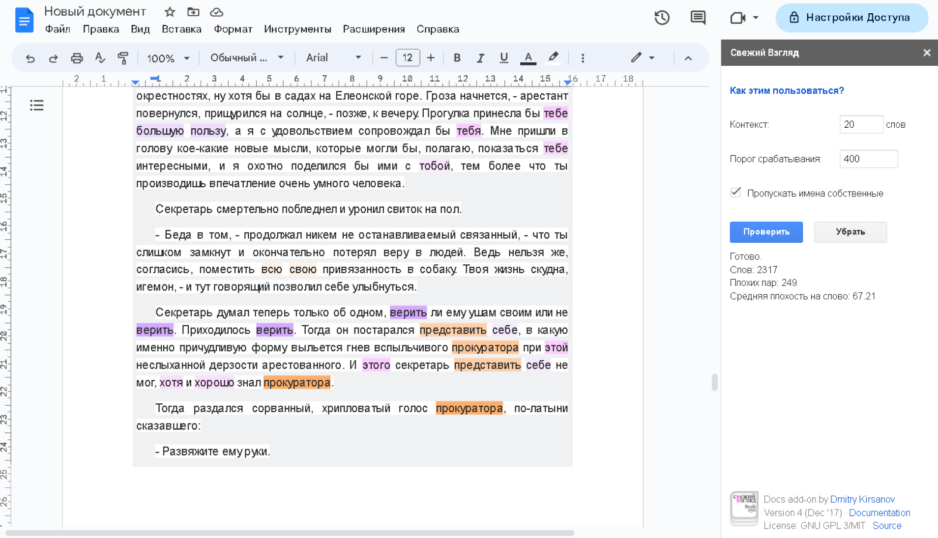 Помощник редакторов и писателей для проверки текстов на стилистические погрешности: тавтологию и близкое расположение однокоренных или фонетически близких слов. При этом диапазон проверки — в пределах какой длины будет осуществляться поиск — вы устанавливаете сами.