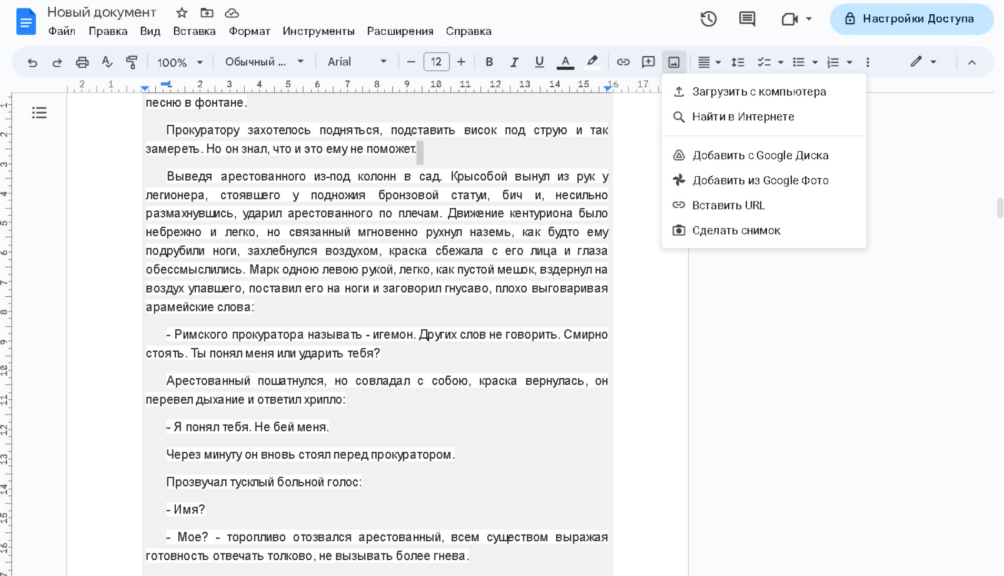 Если у вас есть интернет, то никаких сложностей с поиском информации и картинок не возникнет. Но Google Docs позволяет делать то же самое прямо в документе, с которым вы работаете. Функция «спрятана» по адресу «Вставка — Изображение — Найти в интернете». При ее активации справа откроется панель обычного поиска Google. Также можно вызвать функцию через значок изображения в верхней панели инструментов (скриншот №2).
