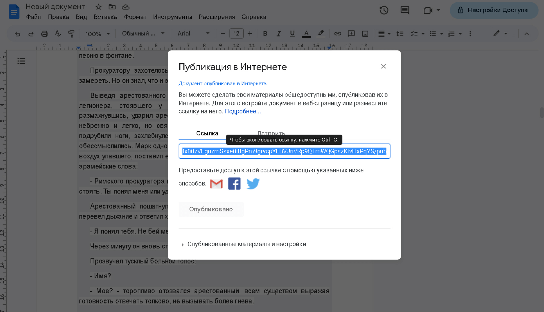 Кстати, предварительно сохранять документ в формате HTML для публикации на сайте вовсе не обязательно — опубликовать текст или его фрагмент можно прямо со страницы сервиса. Делается это через вкладку «Файл — Поделиться — Опубликовать в интернете». При этом сервис автоматически генерирует ссылку, которую надо вставить в тело сайта — на нем появится красиво оформленный блок с выделенным текстом из вашего документа.