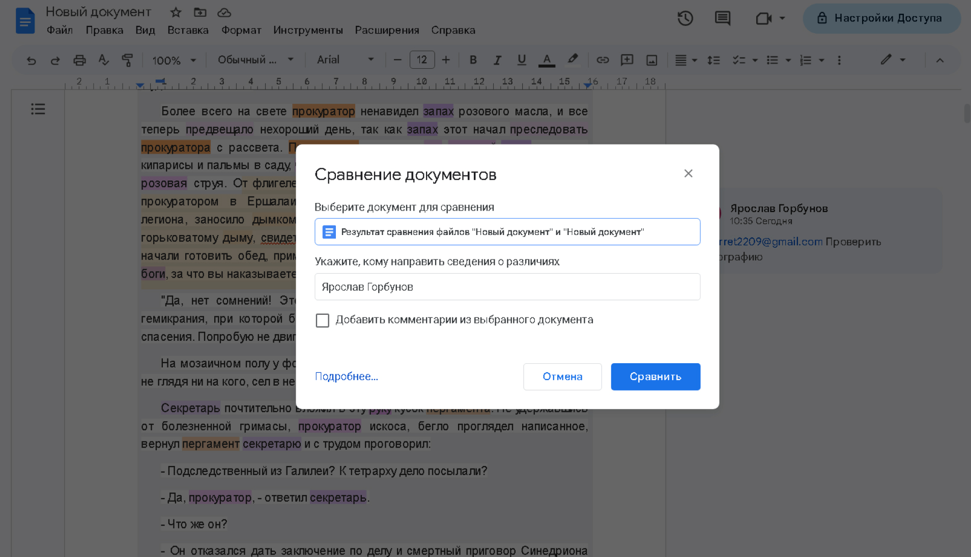 Впрочем, иногда вышеупомянутого инструмента может оказаться недостаточно — тут на помощь придет функция сравнения документов. Вызвать ее можно через «Инструменты — Сравнить документы». Далее выберите для сравнения с текущим любой документ, сохраненный на «Google Диске». В открывшемся окне также можно указать пользователя (себя или любого соавтора), которому будет отправлена информация о различиях сравниваемых документов.