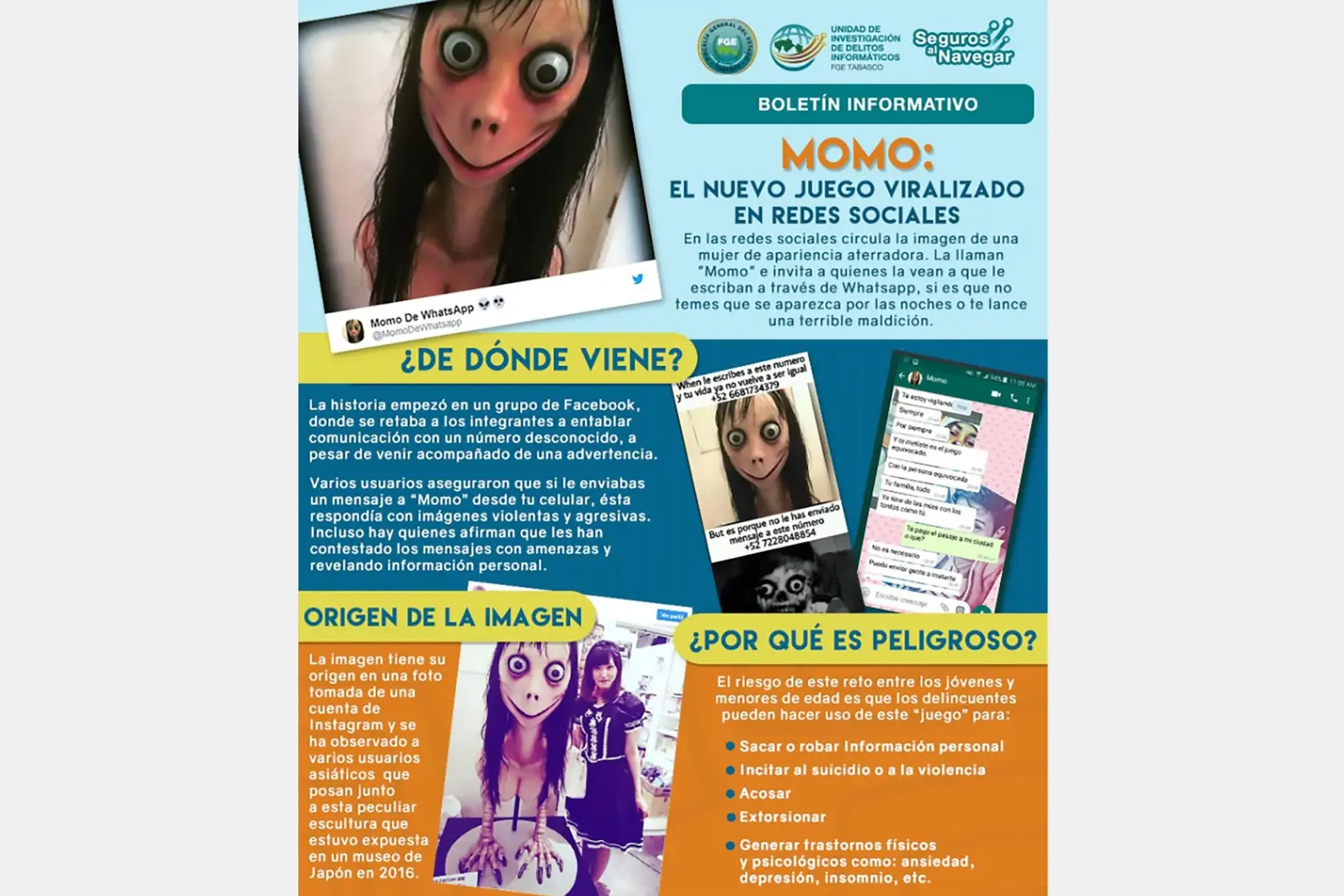 О страшном персонаже Момо во всем мире заговорили в июле 2018 года, после того как в СМИ Южной Америки вышла новость о смерти 12-летней девочки из Аргентины. Местные полицейские в ходе расследования установили, что незадолго до трагедии погибшая переписывалась с некой (неким?) Momo, на аватарке у которой (которого) стояла фотография женщины с устрашающими чертами лица, растрепанными волосами, выпученными глазами и рассеченным ртом.