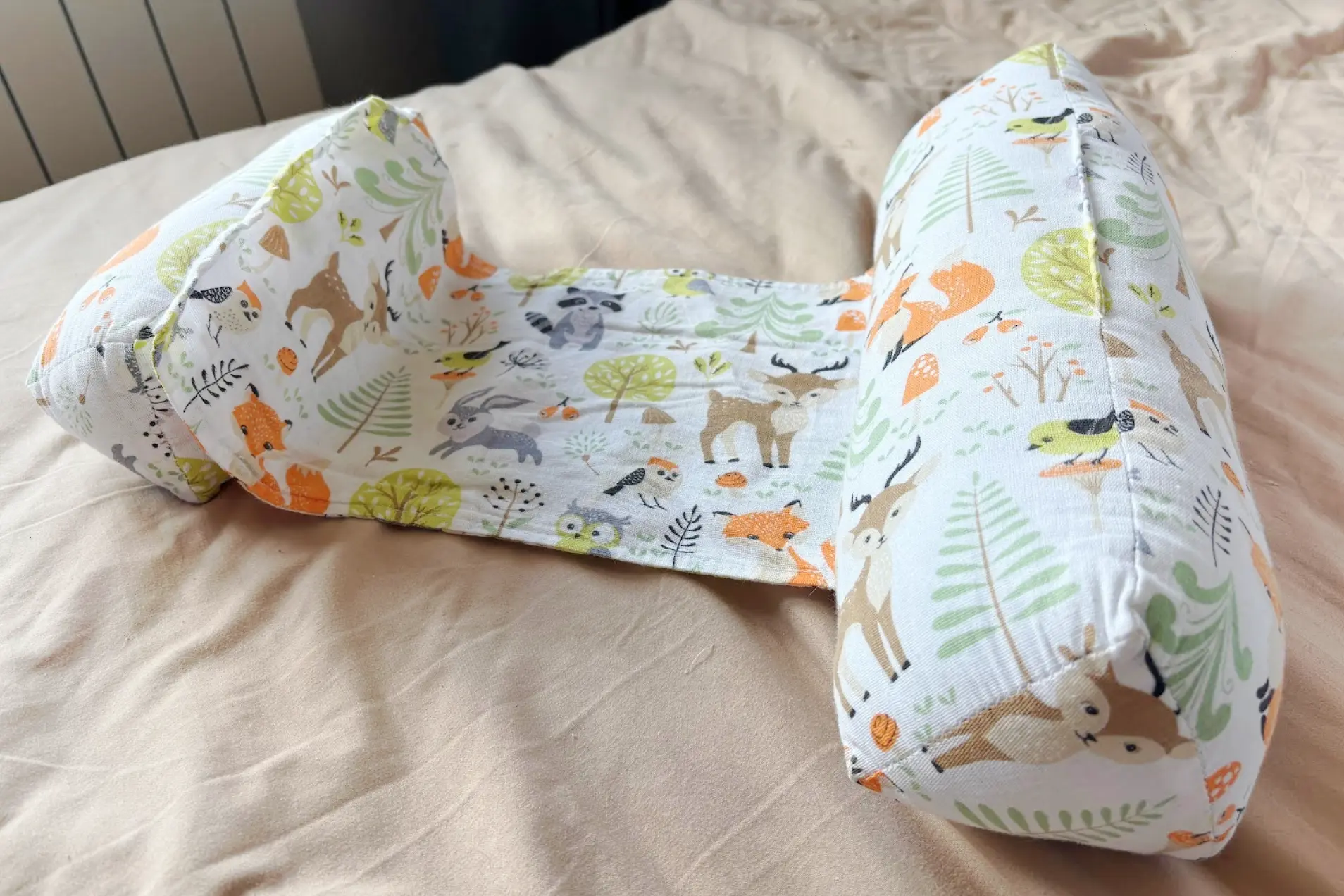 Для того чтобы во время сна ребенок не перевернулся на живот, используют позиционер — два валика-подушки с тканевой перемычкой между ними. Ту же функцию могут выполнять свернутые в рулон пледики, но нам понравился такой вариант, да и стоил недорого — 1000 рублей.