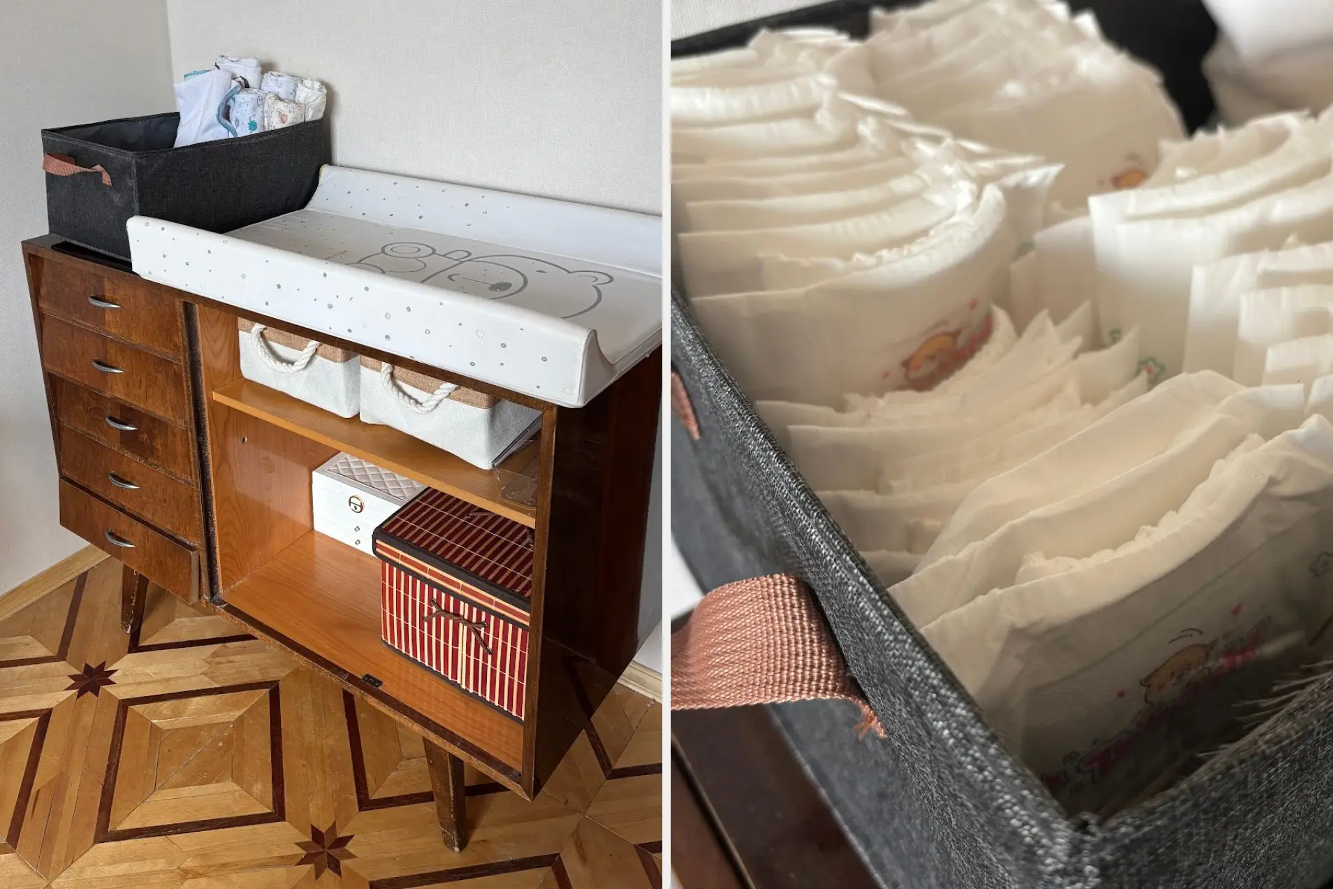 Для организации хранения я купила несколько корзин, коробок и контейнеров. Чтобы понять, какие именно мне понадобятся, я смотрела видео и фото пеленальных столиков у других мамочек. Пришла к выводу, что на поверхности нужна большая корзинка для свернутых в трубочки пеленок и запасных подгузников, корзинка поменьше — для уходовых средств. Остальные контейнеры стоят в ящиках, их надо подбирать исходя из размеров вашего комода. У меня, например, очень низкие ящики, поэтому мне подошли контейнеры для организации косметики. На все ушло 3500 рублей.