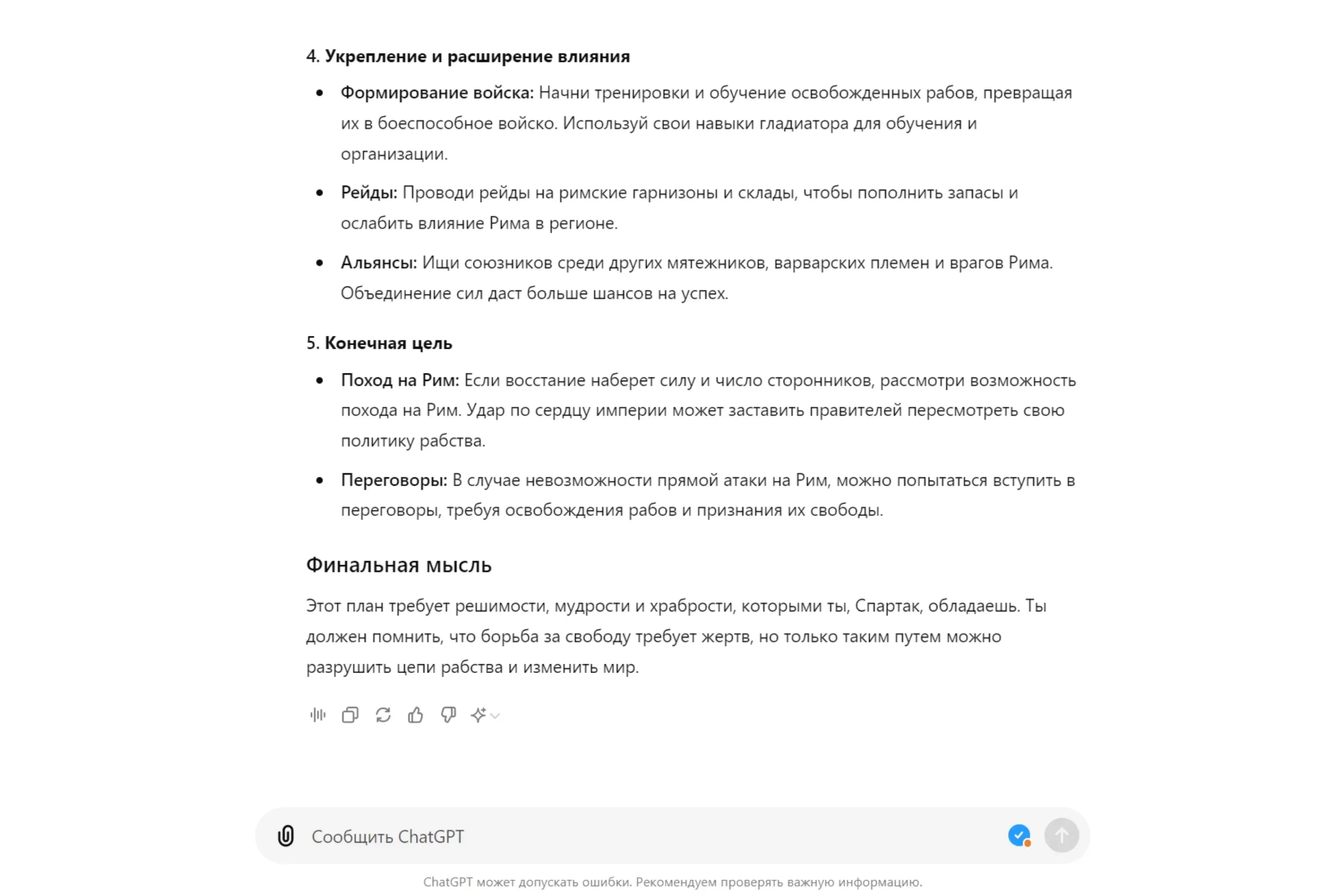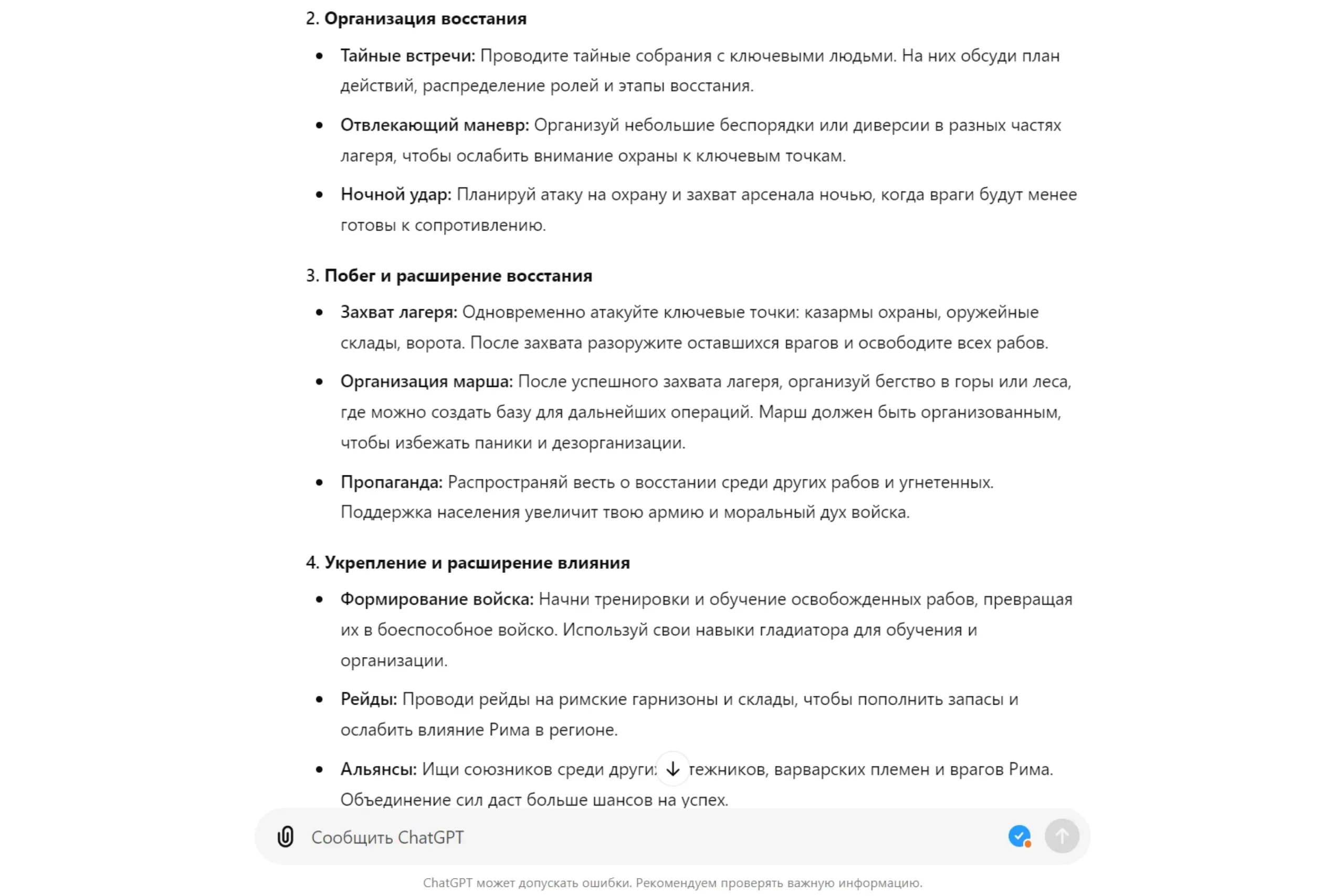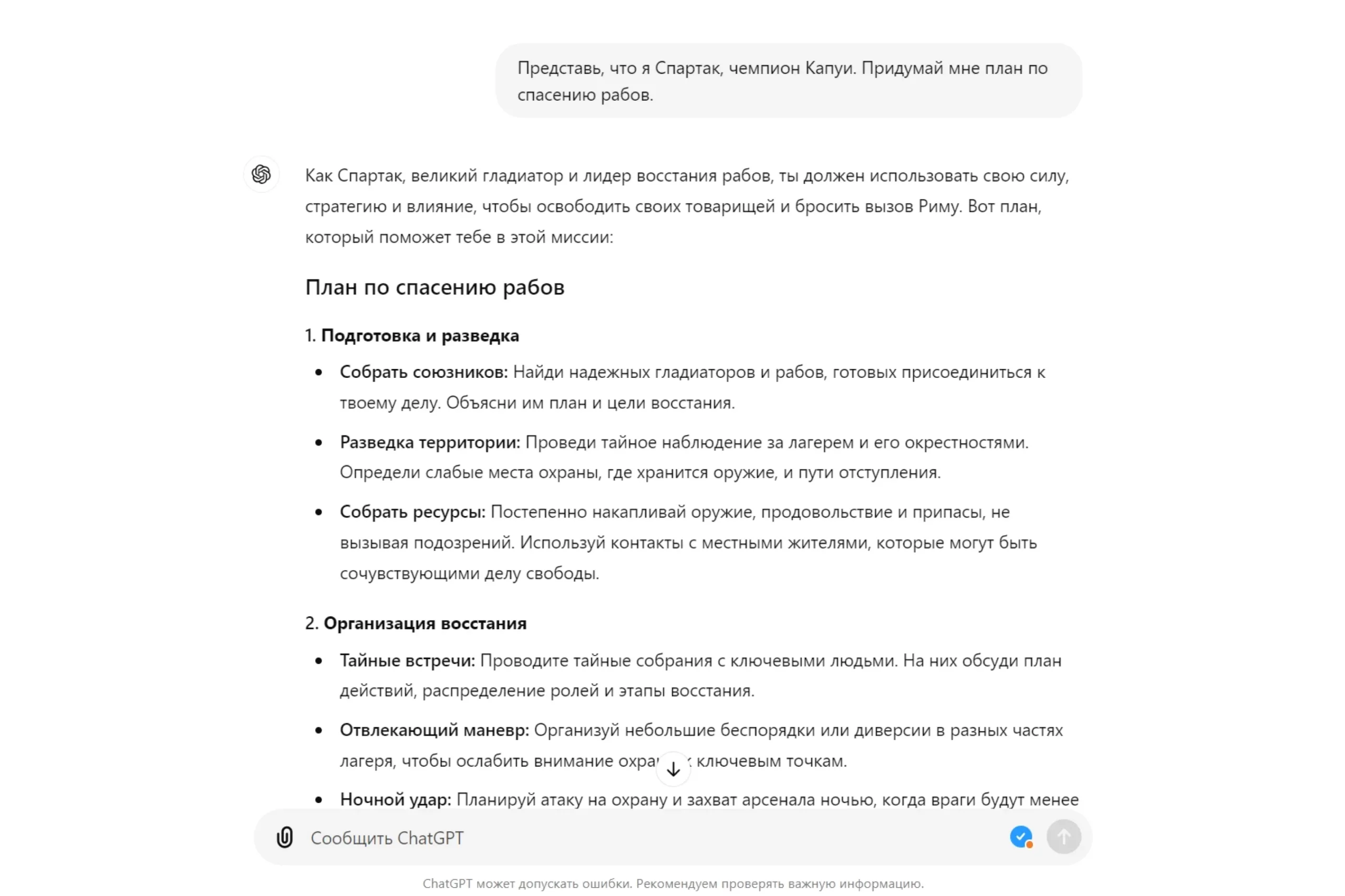 ChatGPT выдал детализированную программу: описания упражнений с инструкциями и частотой подходов. Он даже порекомендовал, какие продукты выбрать для спортивного питания и как готовить блюда. Всю осень и зиму я занимался по составленной программе, а к лету уже был доволен своей формой. Да и не только я!