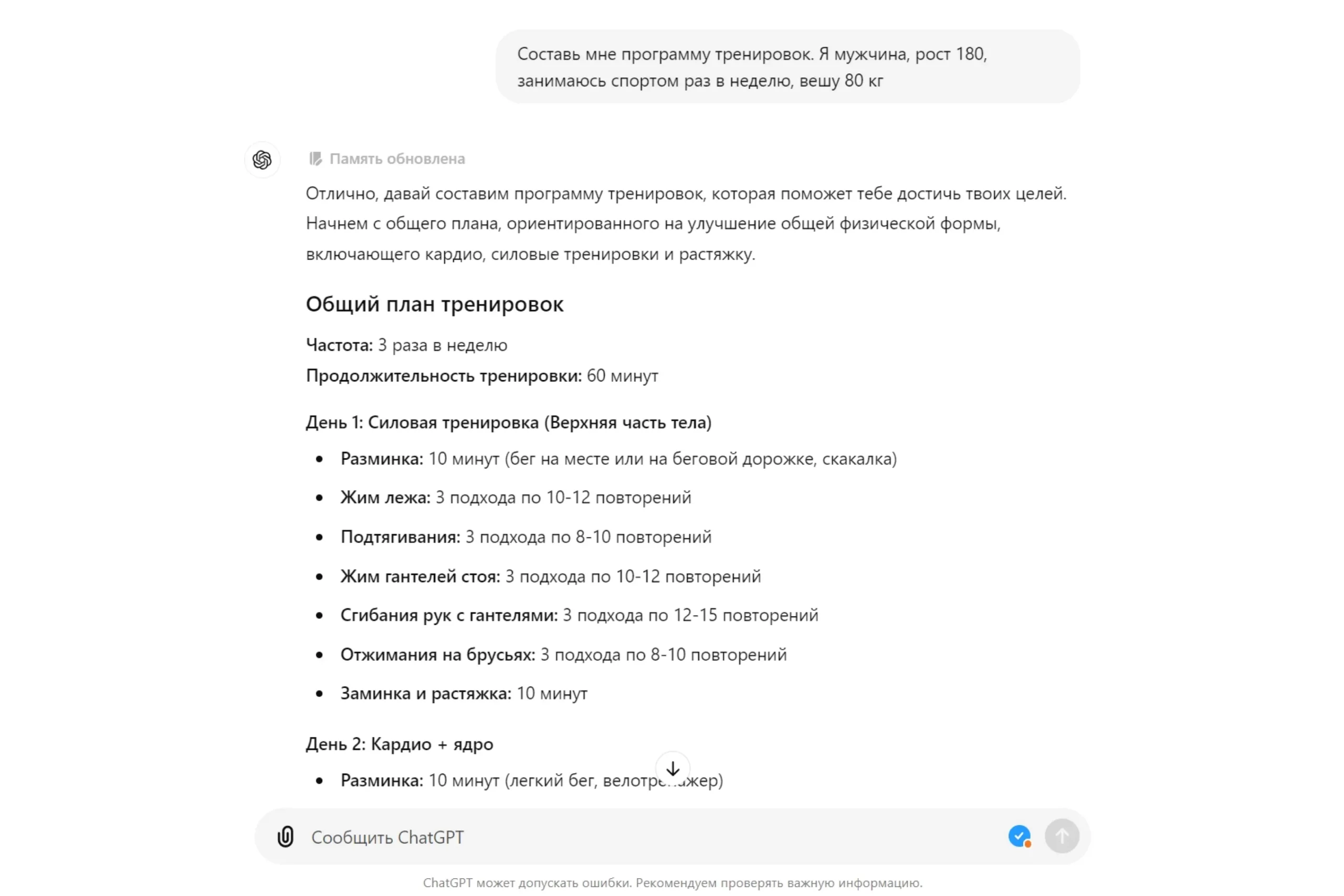 ChatGPT очень помог мне с планированием тренировок. Хотел составить для себя оптимальную программу и заодно получить рекомендации по питанию. Составил подробный запрос: попросил подобрать тренировки под свои цели, физиологические параметры и частоту занятий. Для пущей релевантности написал на английском — так ответ получается более подробным и полезным.