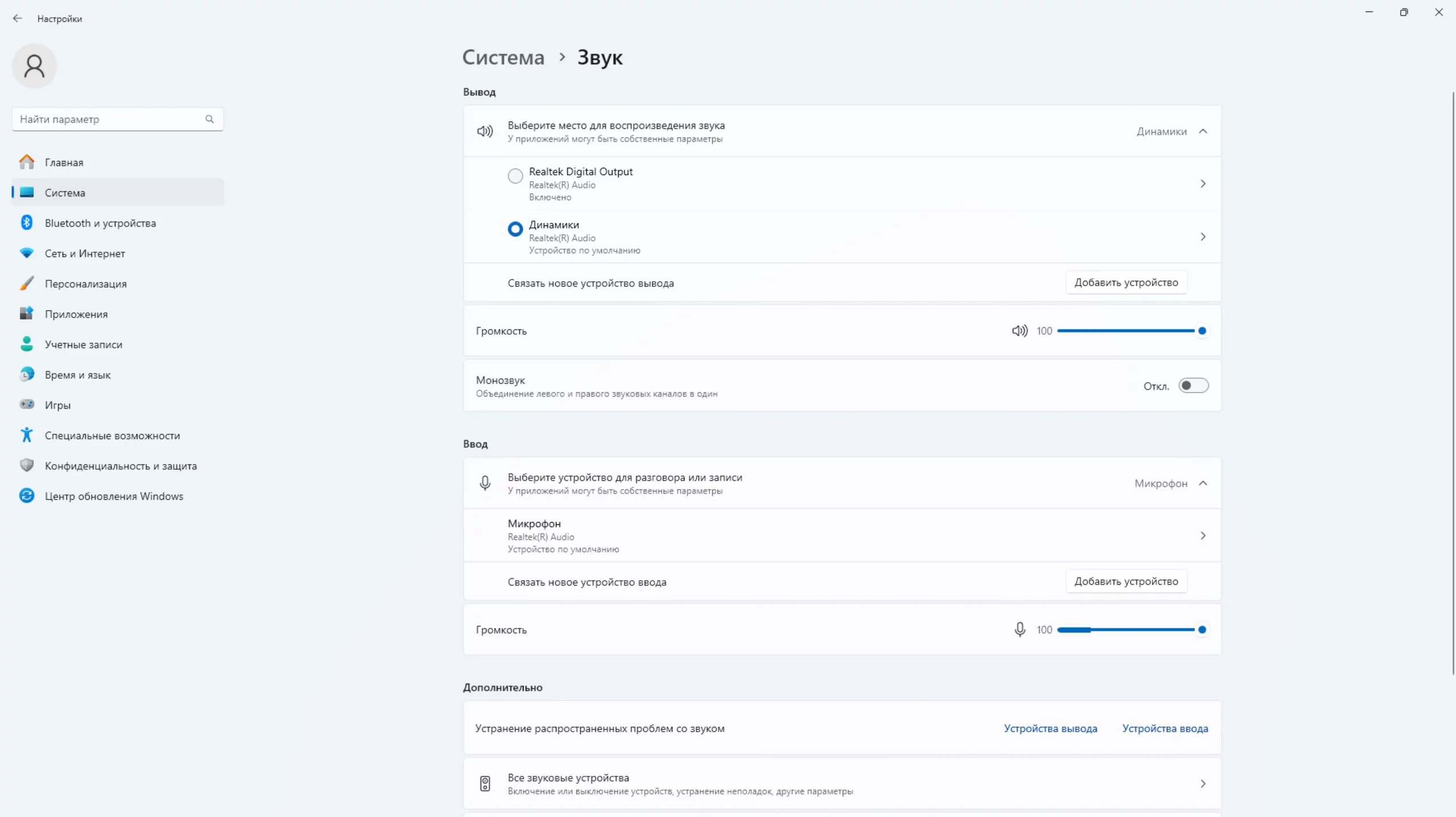 Здесь можно выбрать громкость звука с микрофона. Если подключено несколько микрофонов, выберите один из них в разделе «Ввод».