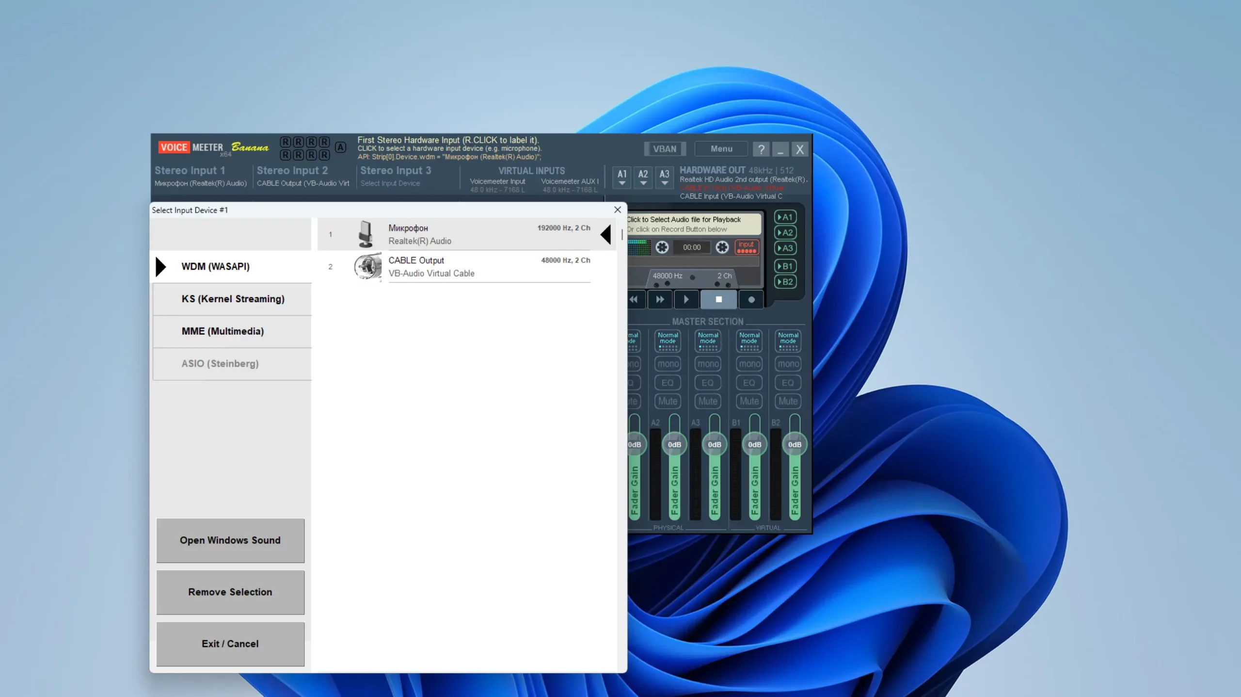 - добавьте микрофон в Voicemeeter как устройство ввода, откройте свойства Stereo Input 1 и выберите микрофон;