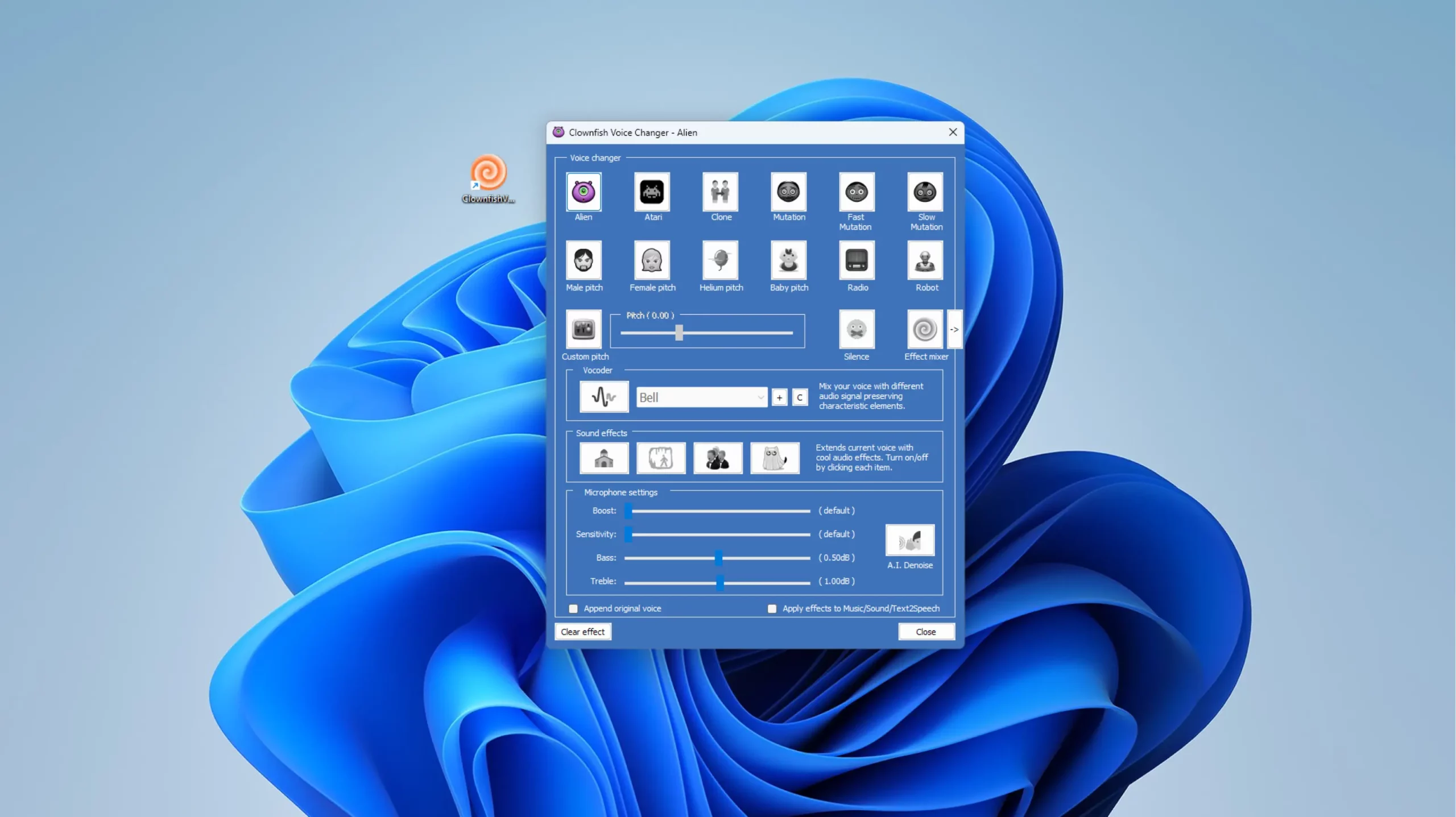 Приложение для настройки микрофона на ПК, созданное в Болгарии. Главная его фишка — изменение голоса говорящего. Для этого у Clownfish имеется 14 пресетов: «Ребенок», «Под гелием», «Пришелец», «Мутант» и другие.