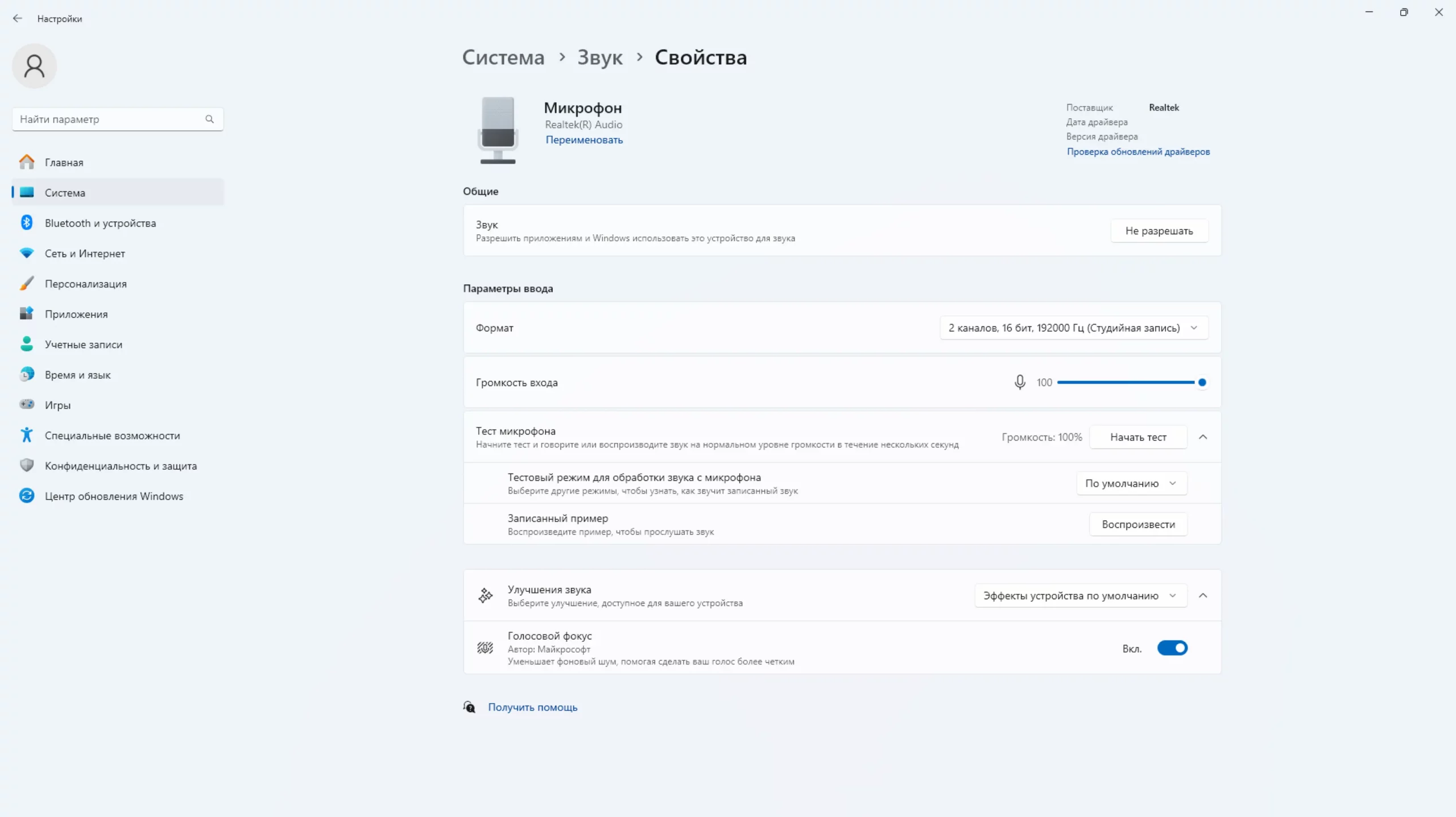 - улучшения звука, поддерживаемые звуковой картой, — на скриншоте включен голосовой фокус;