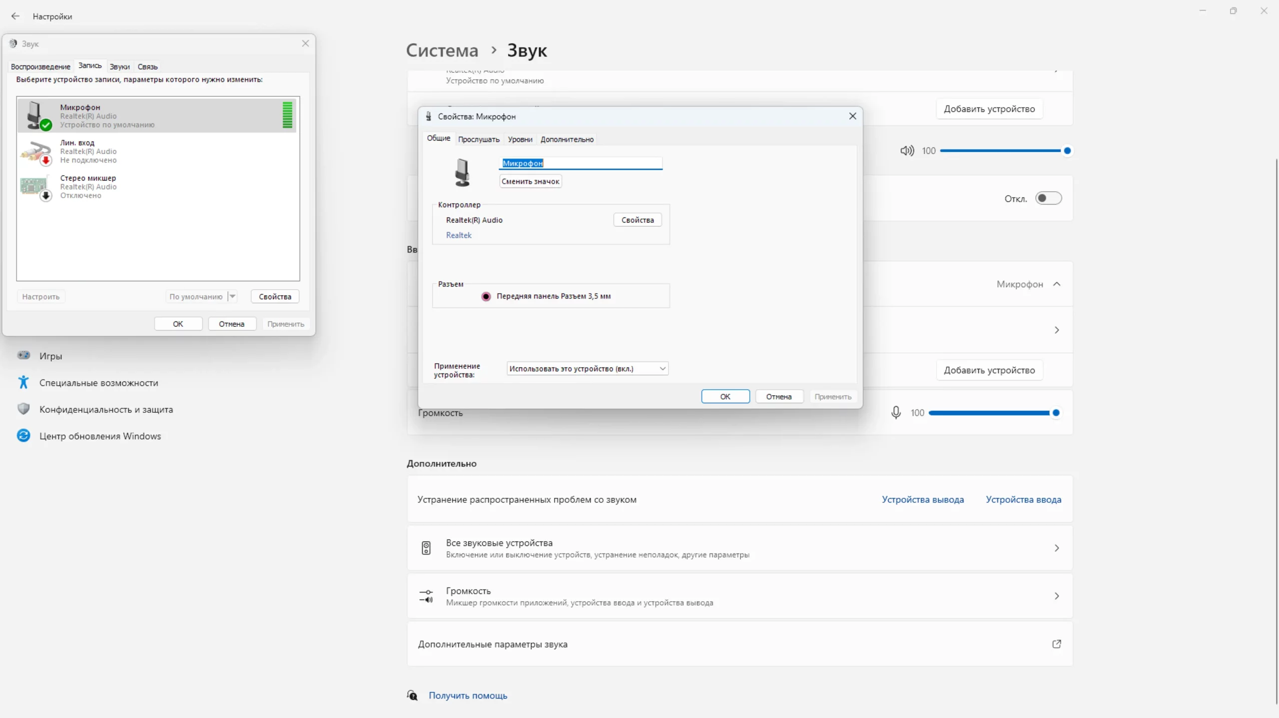 Нажмите на пункт с микрофоном — и вы перейдете в его свойства. Здесь доступны: