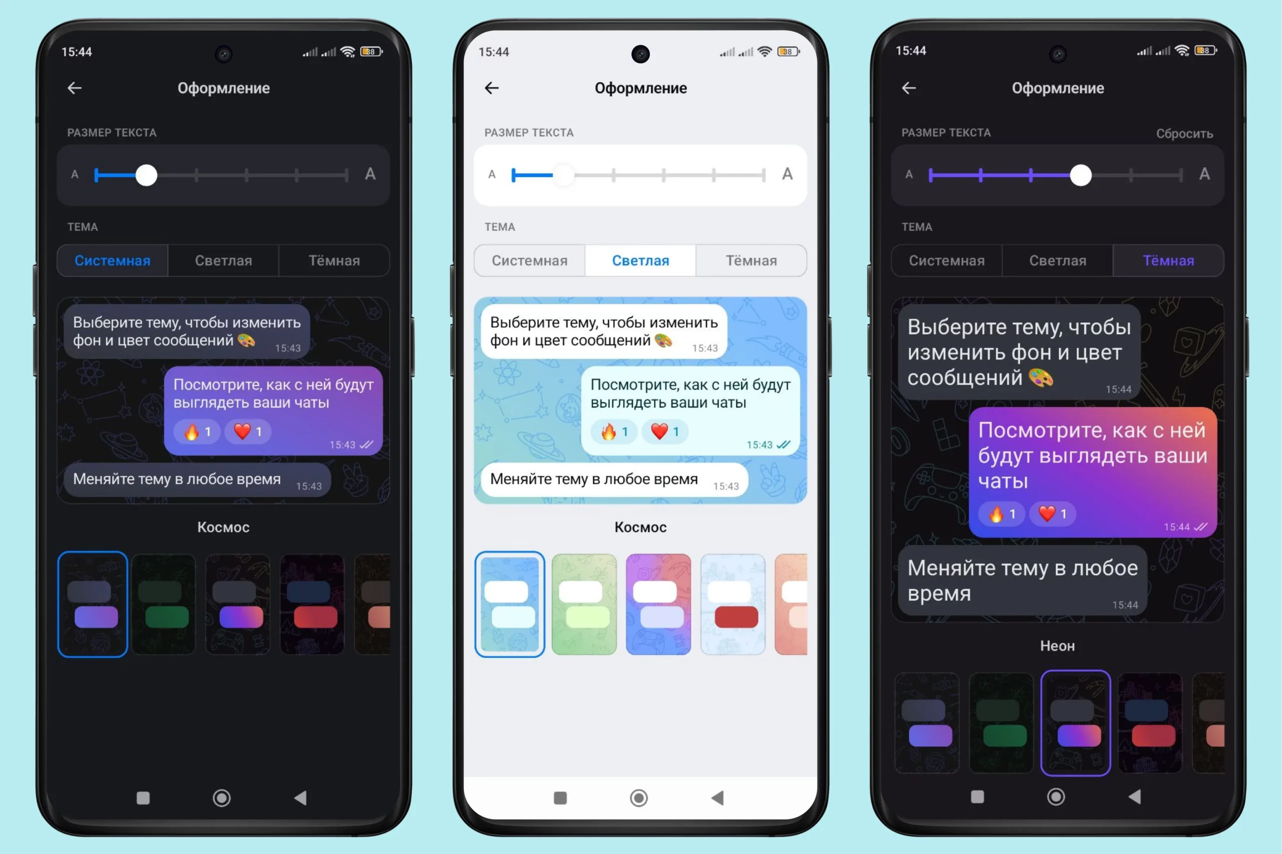 Это то, как будет выглядеть мессенджер. Можно установить размер текста, выбрать тему, подобрать фон и цвета сообщений.