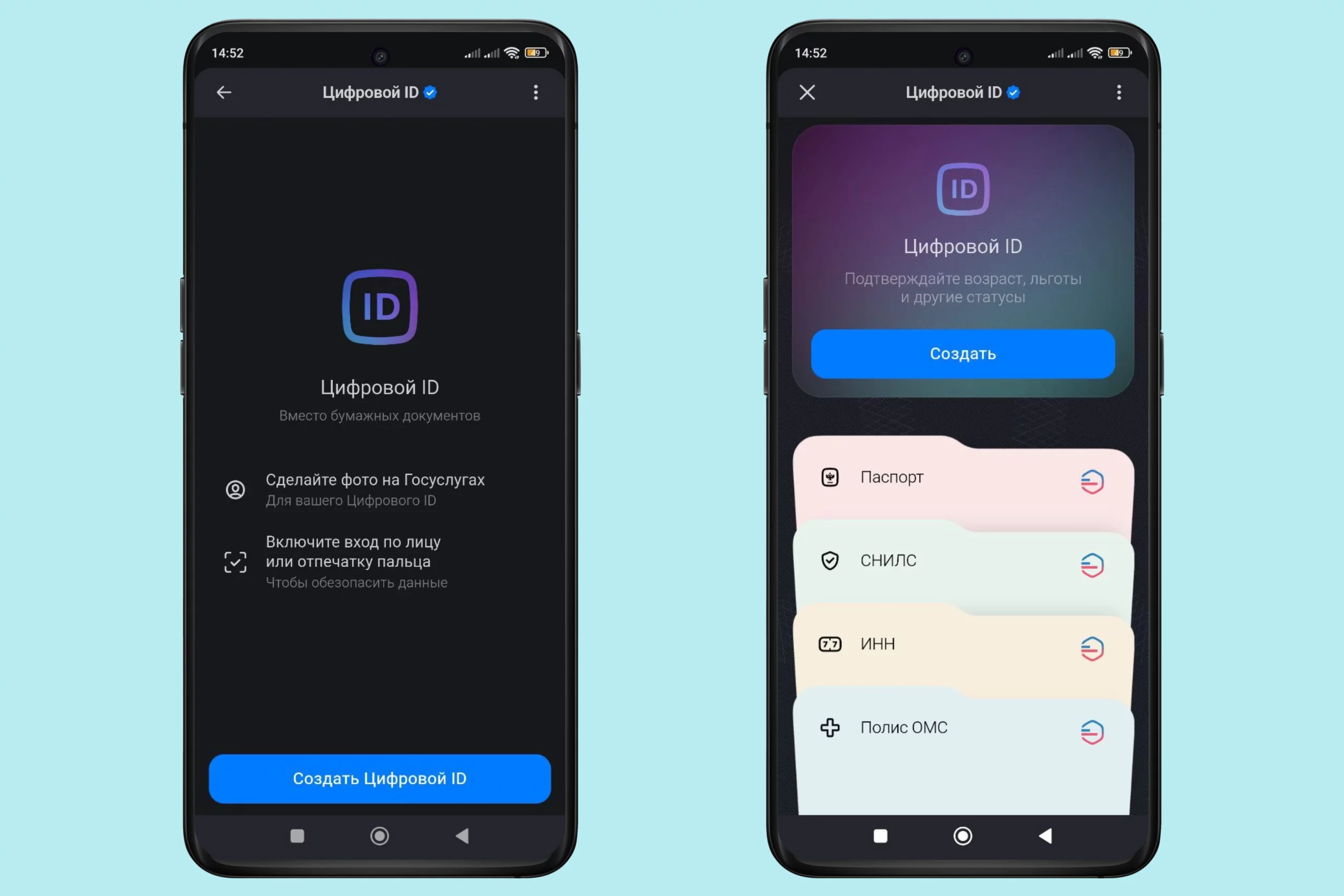 Чтобы создать Цифровой ID, перейдите в этот раздел, нажмите на кнопку «Создать», ознакомьтесь с возможностями и тапните «Создать Цифровой ID». После этого вы перейдете в «Госуслуги». Далее следуйте инструкциям портала.