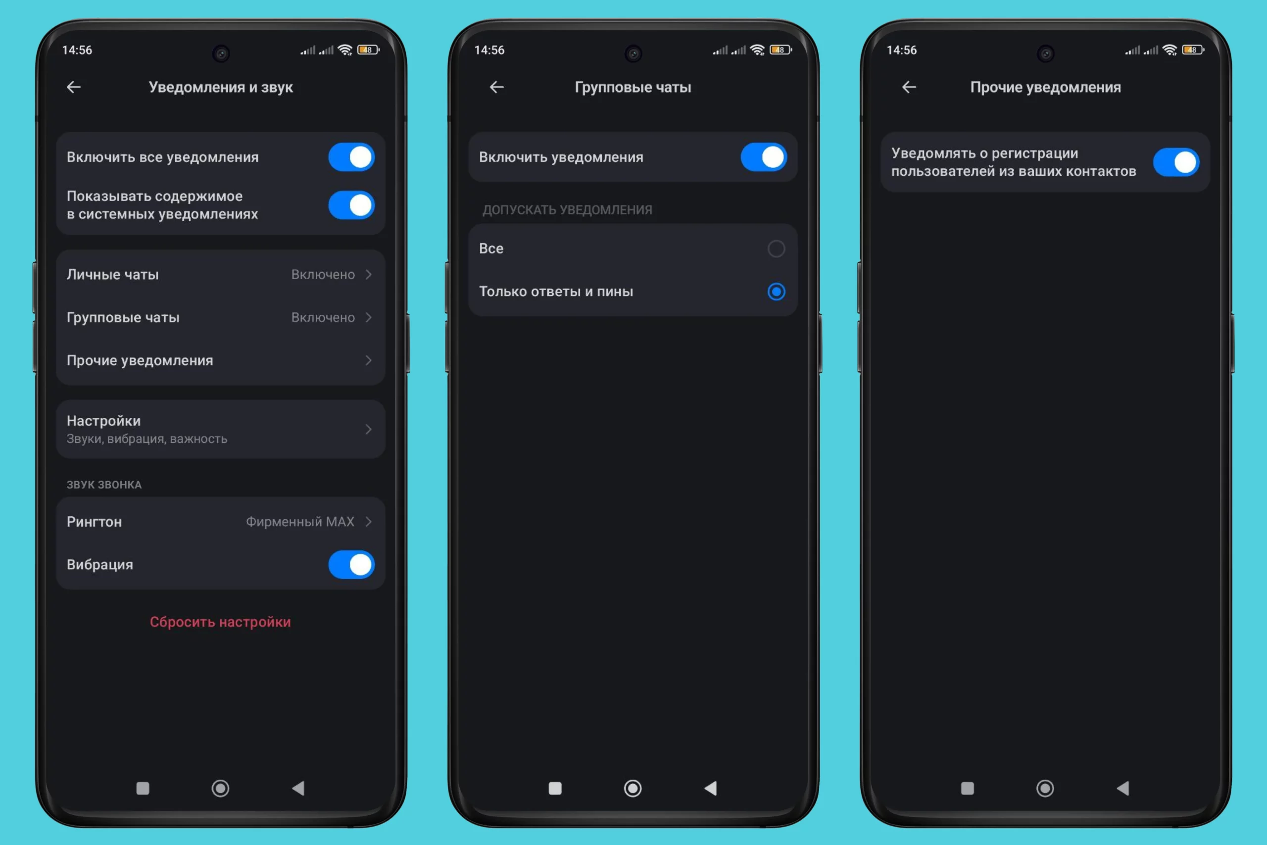 Вы можете включить или отключить уведомления, настроить звуки, вибрацию, приоритет чатов.