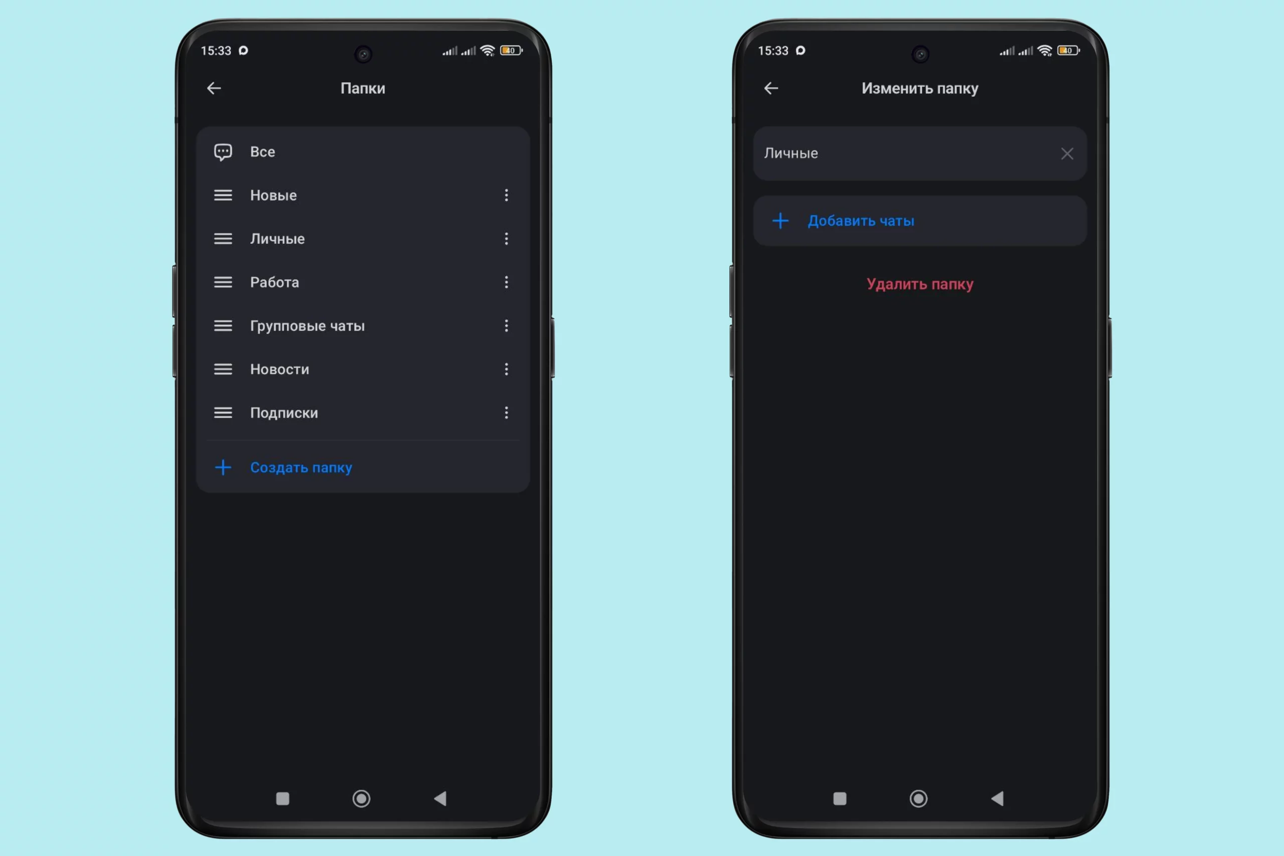 Добавлять чаты в папки можно на странице «Чаты». Удерживайте палец на диалоге, пока не появится меню. Выберите «Добавить в папку». Там же можно закрепить чат, отметить сообщение непрочитанным, отключить уведомления, заблокировать пользователя и удалить переписку.