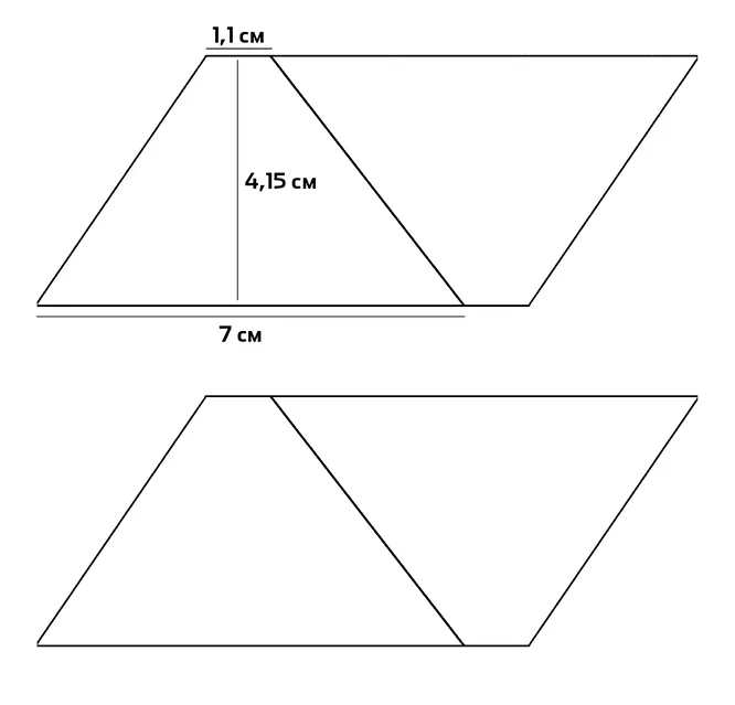 - Сложите их рядом и склейте стороны скотчем так, чтобы получилась пирамида со сторонами в виде четырех трапеций.