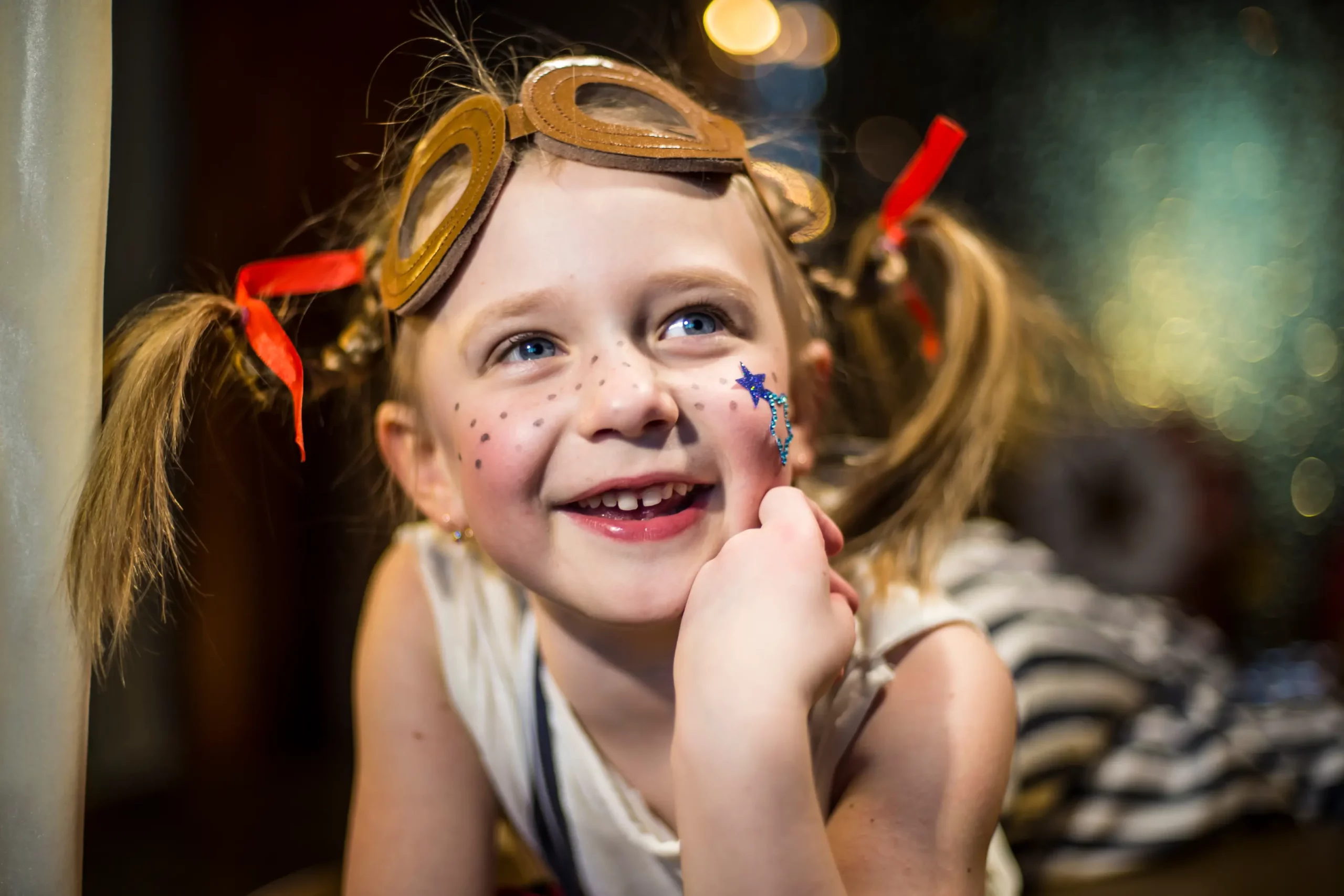 Пожалуй, самая сложная задача для настоящего спектакля. Если пространство позволяет, в качестве сцены подойдет недорогой тент. Спереди закрепите ткань в качестве занавеса, а по бокам подвесьте световые гирлянды — они послужат дополнительным освещением и создадут естественные границы сценического пространства.
