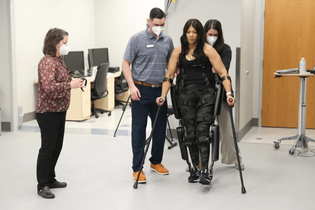 Чудо случилось благодаря экзоскелету — конструкции из прочного внешнего каркаса, роботизированных ног и приводов. В таком нейроконтролируемом протезе пациенты могут самостоятельно вставать и ходить — экзоскелет обеспечивает механическую поддержку всего тела.