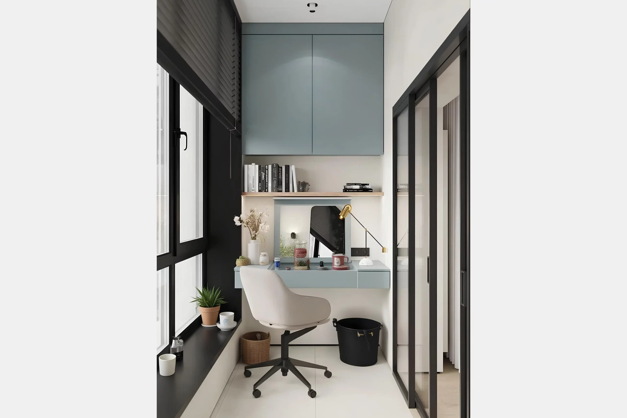 Чтобы балкон не выглядел слишком «салонным», добавили зелени: одно крупное растение в кашпо у окна и несколько маленьких горшков на подоконнике. Они смягчили строгие черные рамы и добавили уюта. Получился рабочий уголок для мамы с акцентом на ее любовь к помадам и кремам.