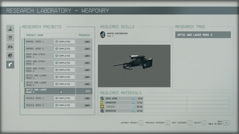 В Starfield, помимо системы прокачки с испытаниями, у вас накладываются еще переменные: навык крафта модулей открывает лишь право изучить эти модули путем вложения ресурсов в каждый отдельный (надульники первого ранга, приклады первого ранга, прицелы первого ранга и так далее). После чего вам нужно опять собирать ресурсы уже на непосредственное создание обвесов. Причем эти ресурсы — отдельные предметы, которые придется собирать по разным планетам, система составных частей внутри попадающегося везде мусора исчезла.