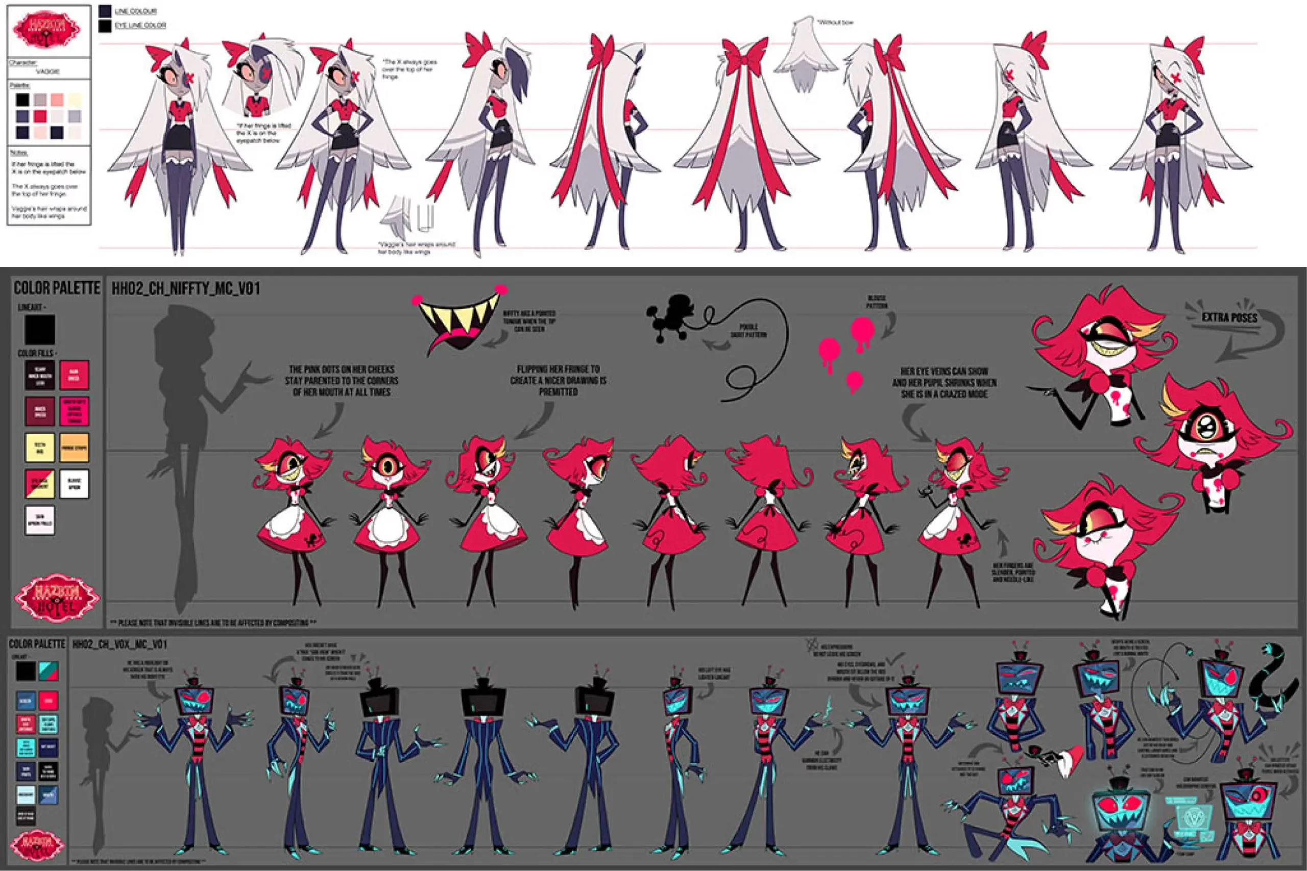 - На стиль «Отеля Хазбин» повлияли легенды анимации и мрачной эстетики — от Брюса Тимма, создателя знаменитых силуэтов Арлекина и Ядовитого Плюща, до Тима Бертона, карикатуриста Джонена Васкеса и классики Disney. Вивьен Медрано называет этот коктейль «тимбертонизмом» — ее собственным термином для описания детализированного, готического, но при этом игривого стиля. «Мне нравится, когда персонажи немного гротескны — в движении, эмоциях, в одежде. Это отвечает моим чувствам как художника», — рассказывала она в интервью Animation Magazine.