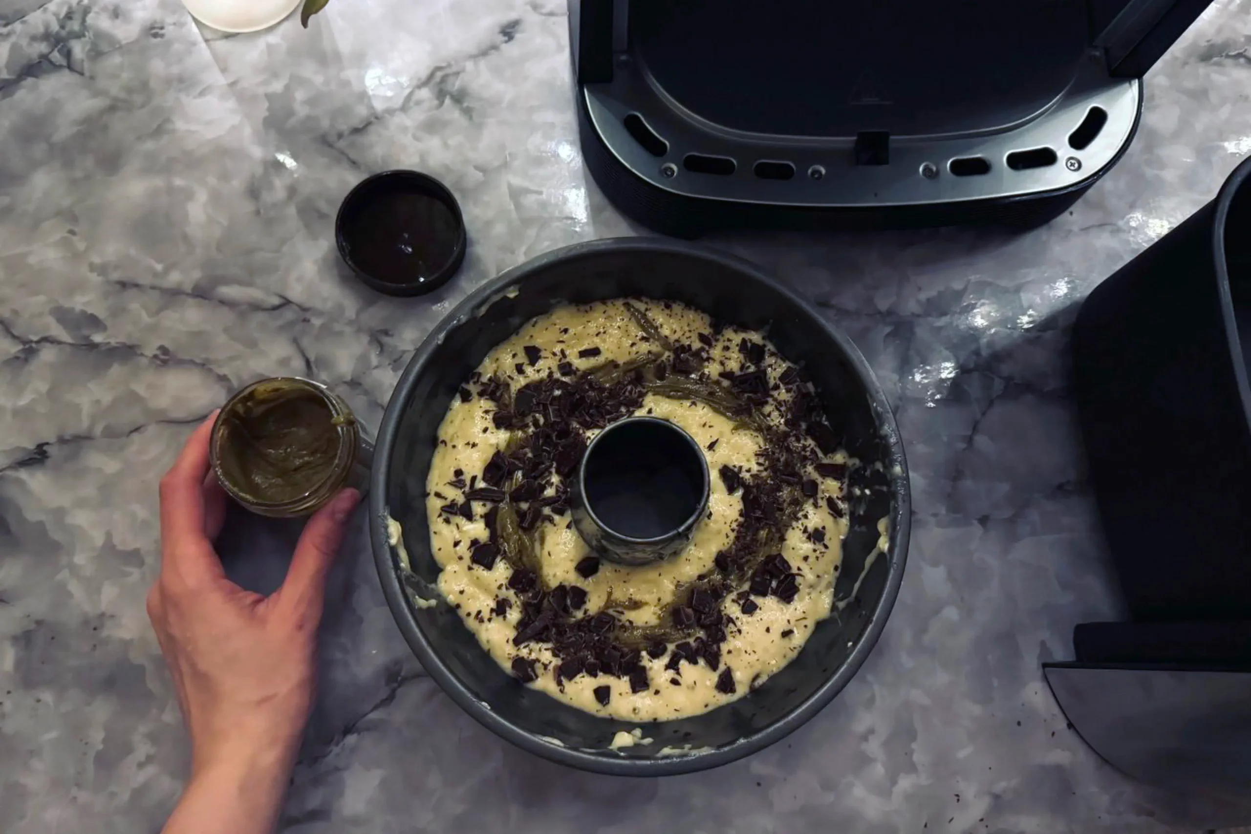 Как только вы добавите пасту и шоколад, залейте в форму оставшееся тесто. Специальной формы для кулича у меня не было, поэтому я воспользовалась формочкой для кекса.