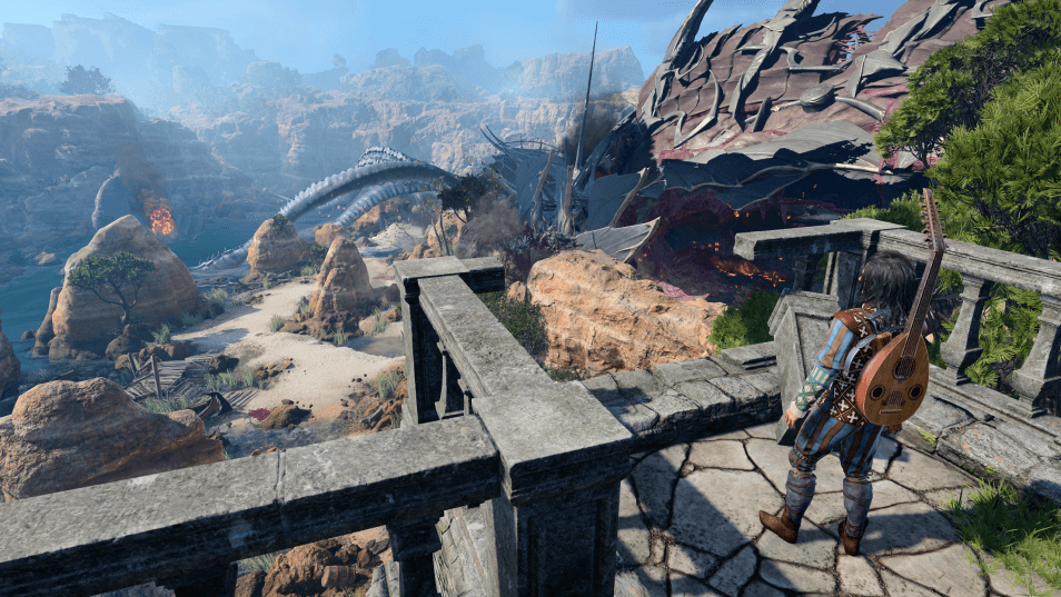 Давайте поговорим о более понятных вещах. Об эстетике, графике, звуке. Тут получится кратко: все здорово, особенно для жанра RPG. Обычно, чтобы реализовать такой уровень свободы в играх, отыгрыша и иммерсивных механик, приходится жертвовать визуальной частью. Яркий пример — The Legend of Zelda: Tears of the Kingdom (о которой у нас есть отдельный текст). В ней в обмен на очень упрощенную и мультяшную графику геймеры получили возможность собирать роботов, убивать врагов безумными фокусами с физикой и летать по карте на самодельных самолетах. Компромисс, по итогу которого игроки получили невероятный опыт.