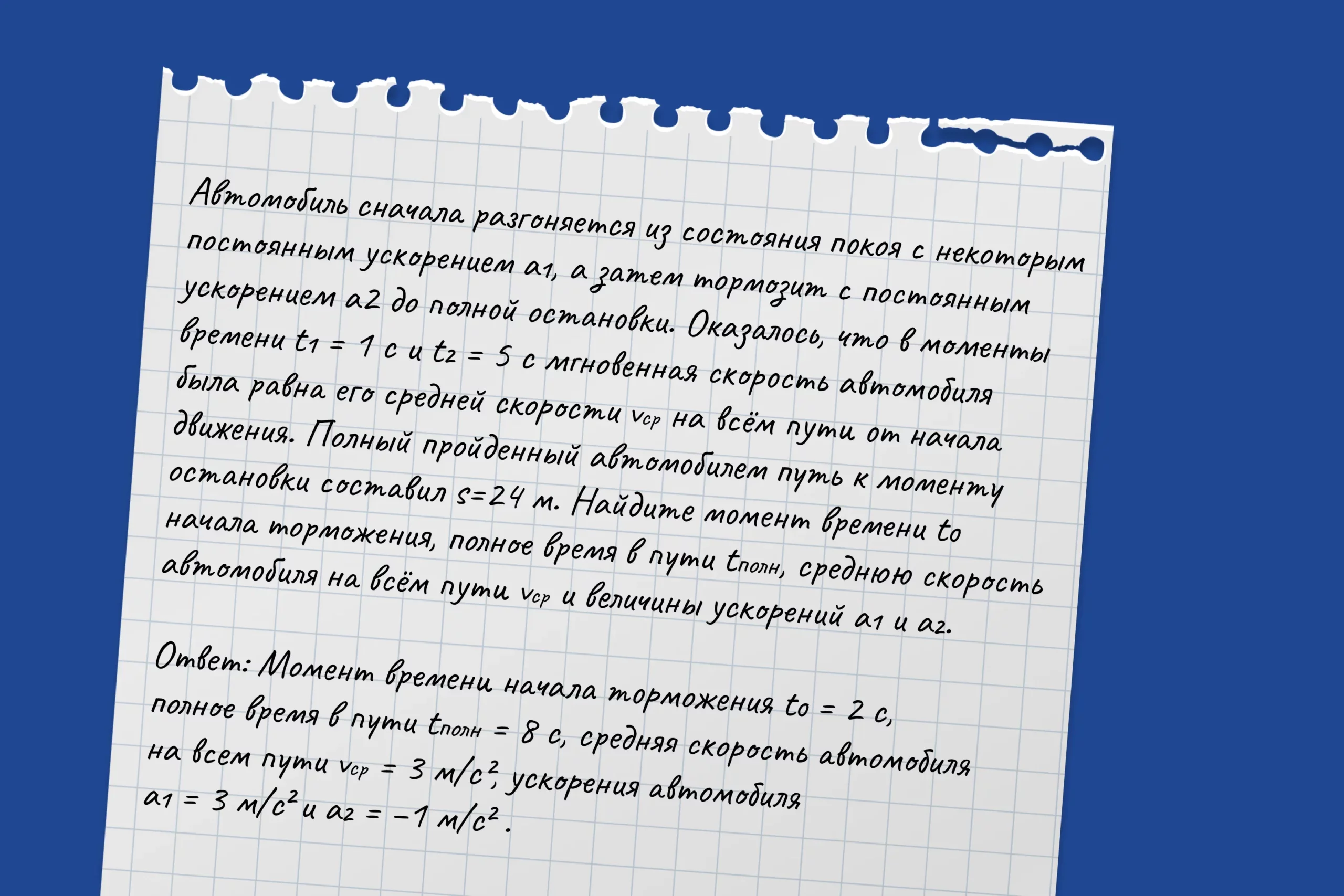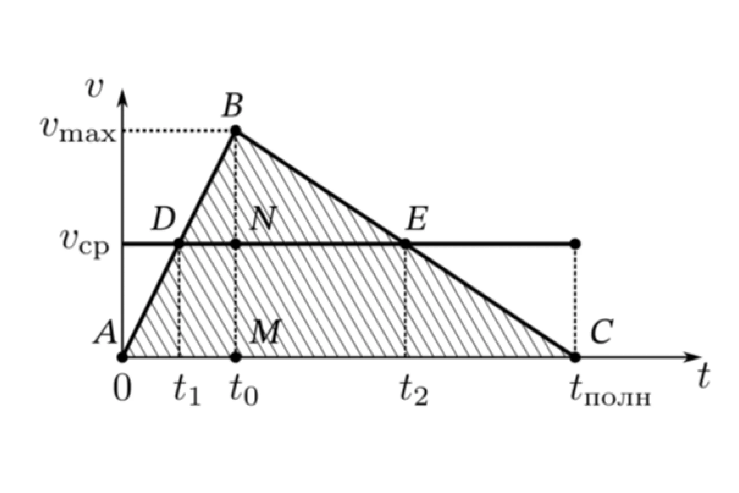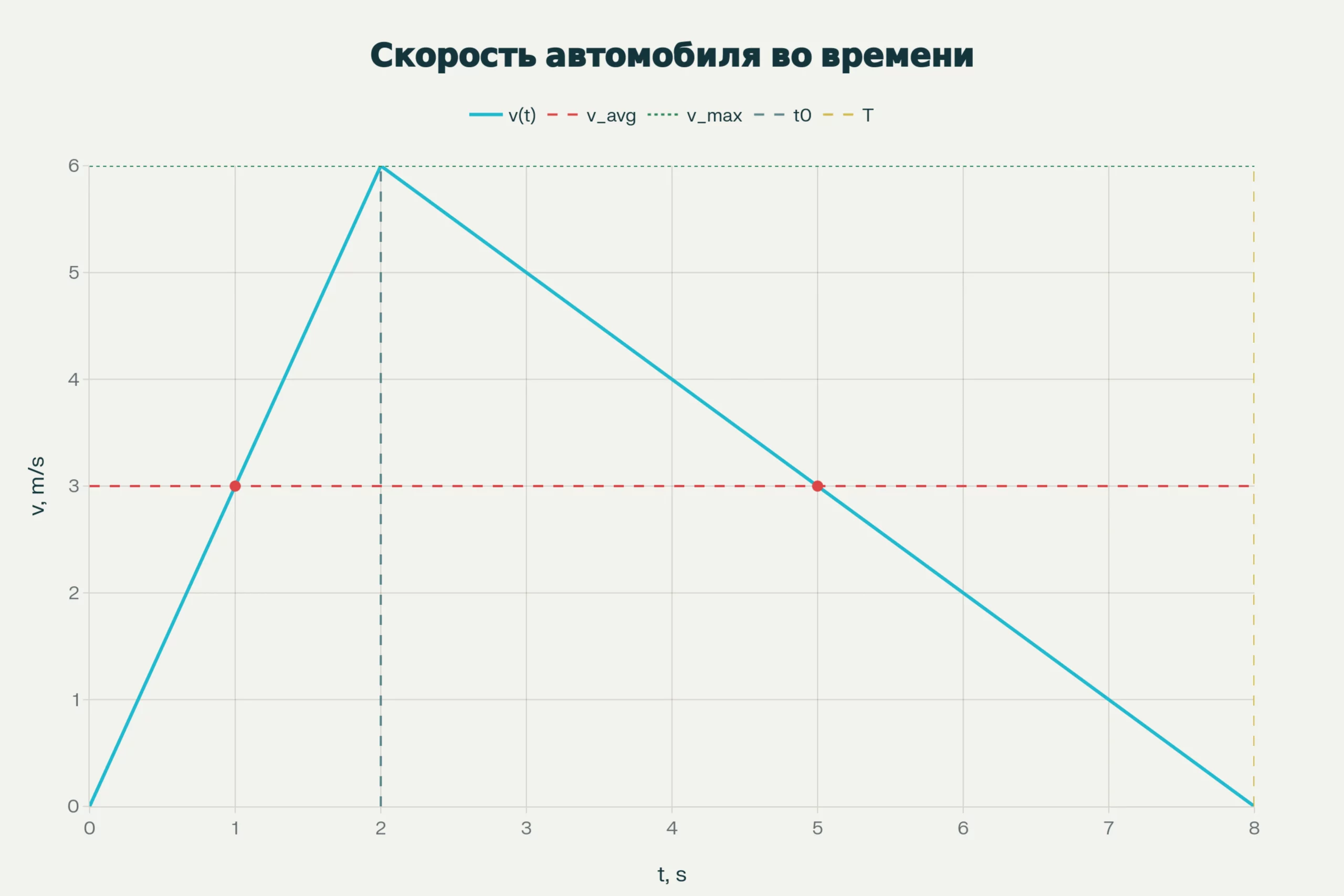 Подсматриваем в решебник. Для решения этой задачи необходимо построить график зависимости мгновенной скорости от времени и показать уровень средней и максимальной скорости, момент начала торможения и полное время в пути. Вот как этот график выглядит в решебнике.