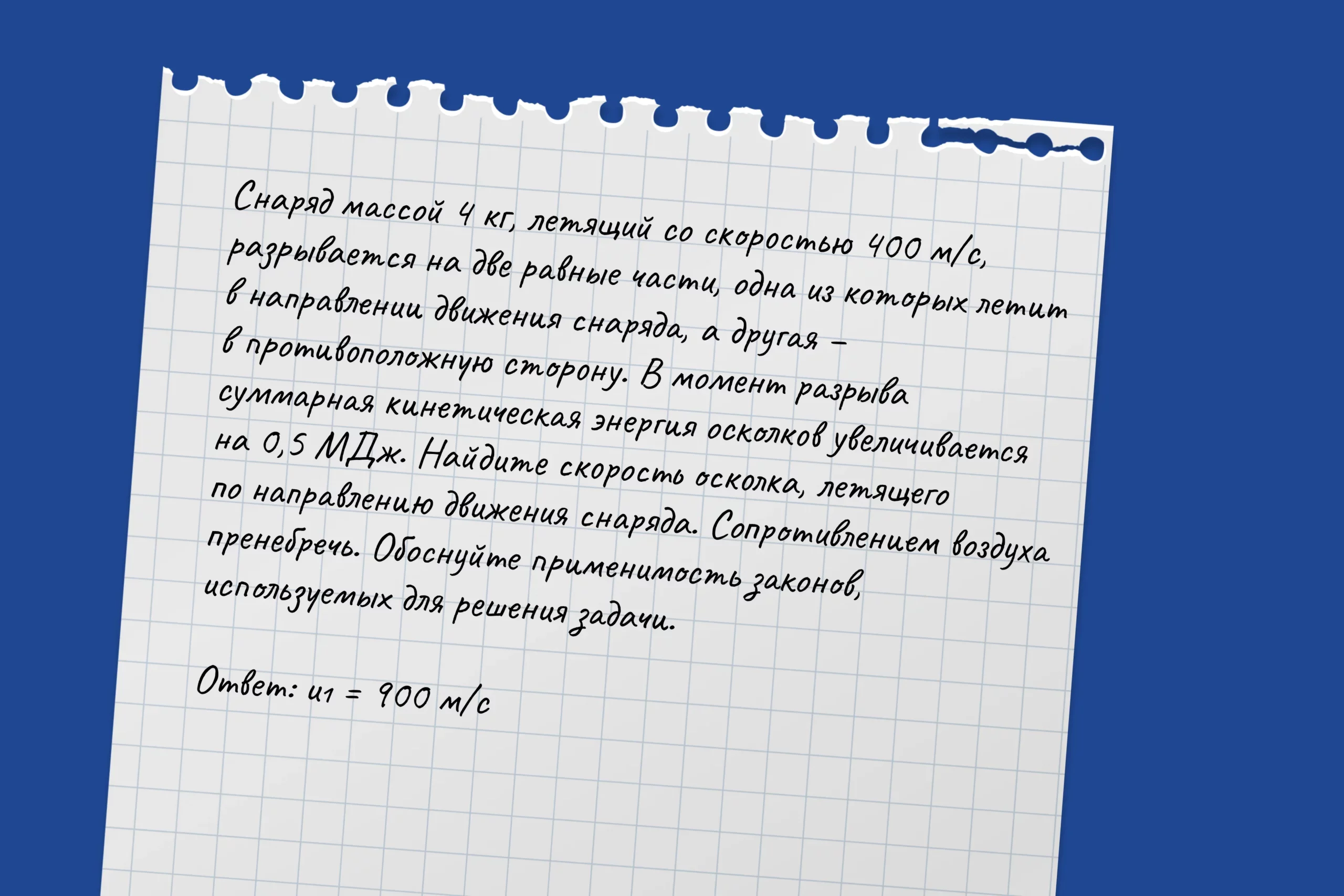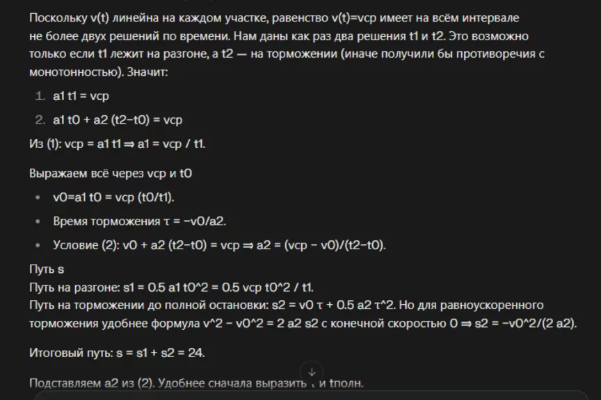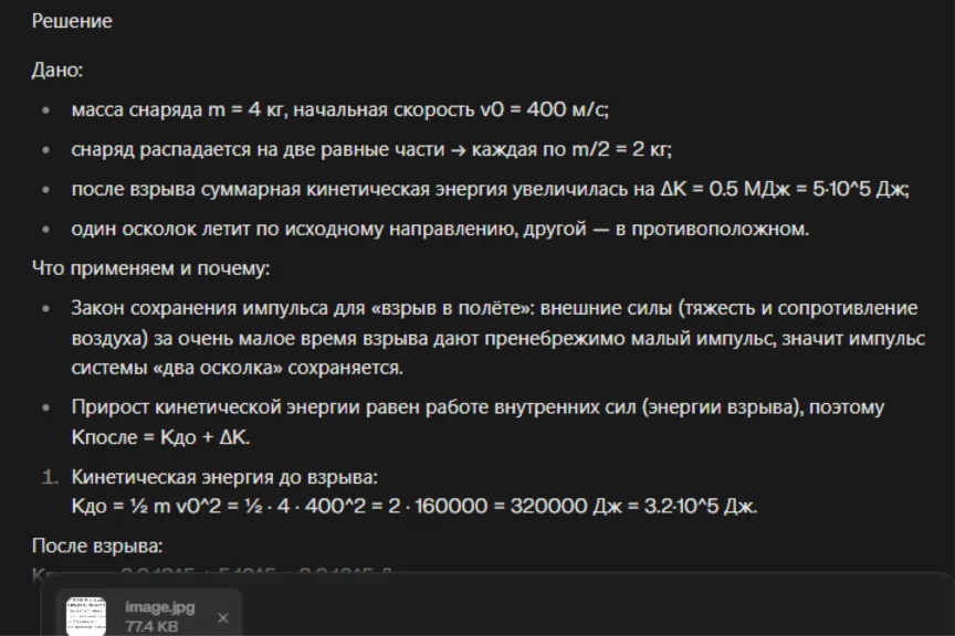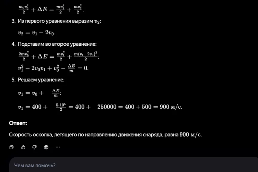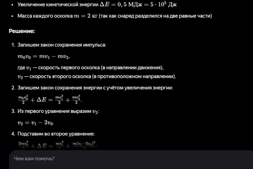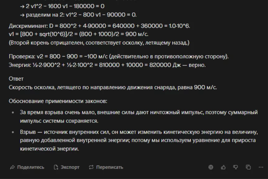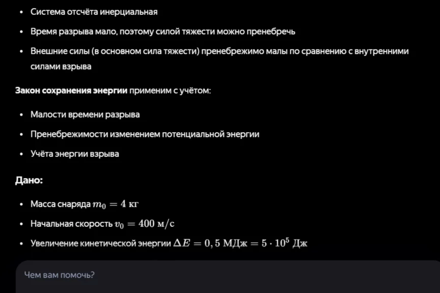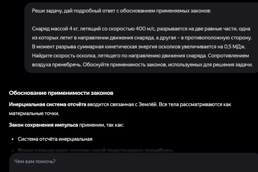 Для описания разрыва снаряда в авторском решении предлагается использовать закон сохранения импульса системы тел, а при описании его движения — модель материальной точки. Посмотрим, как подойдет к задаче нейросеть. На всякий случай попросили ИИ дать не только развернутый ответ, но и обоснование.